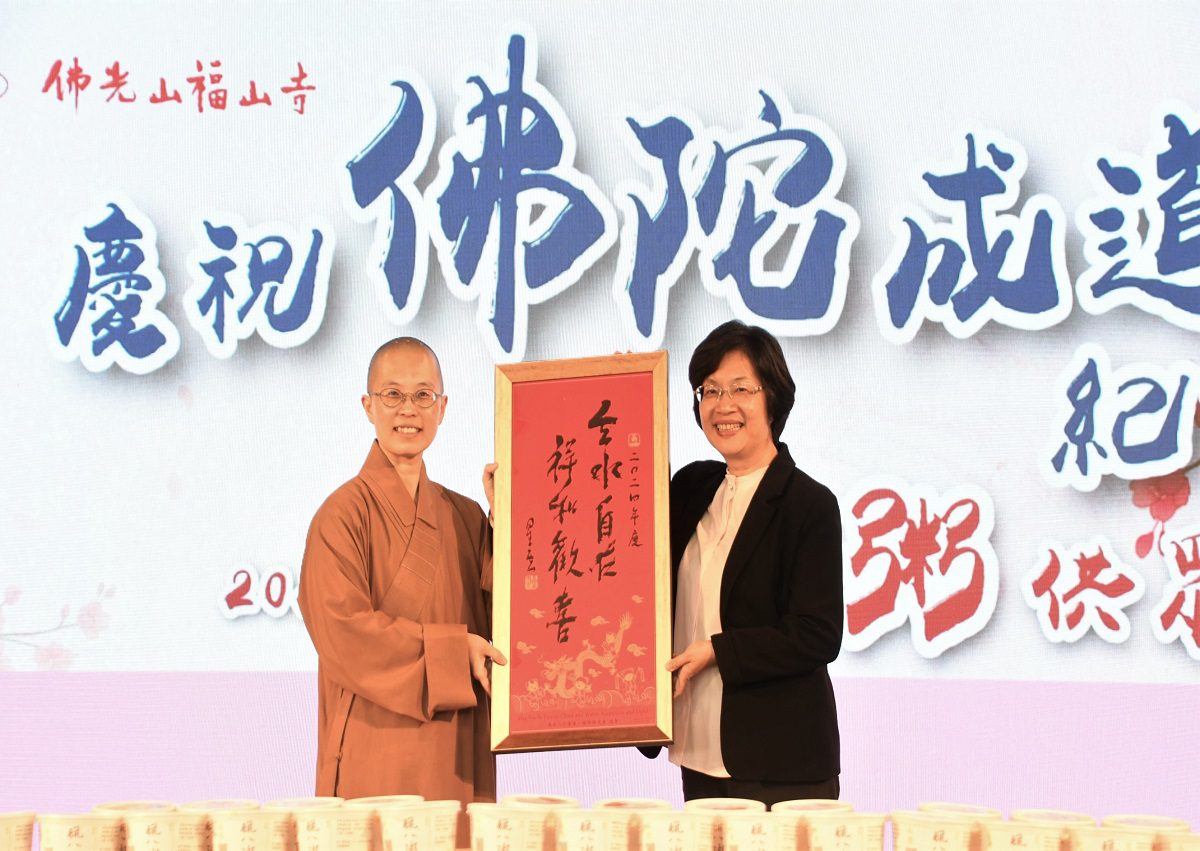王惠美表示,感謝佛光山長期對教育、文化、慈善及醫療等各種利生事業的付出跟貢獻,感謝妙宥法師的教導及師兄姐的努力,讓星雲法師的佛法普及眾生,讓彰化更好,特別再感謝師兄師姐起大早為大家做「臘八粥」,讓大家共沾法喜。
