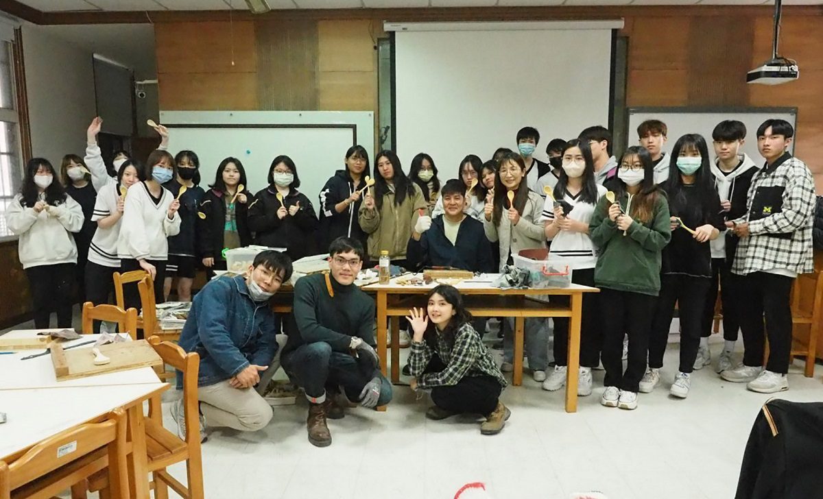與鶯歌工商攜手合作,造形藝術學系日籍教師吉田敦到鶯歌工商辦理木雕工藝體驗營,以「我自己的木湯匙」為主題,帶領廣設科學生動手做,體驗木雕的奧妙,促進藝術創造力和技能,進一步了解美術領域未來發展的多元可能。
