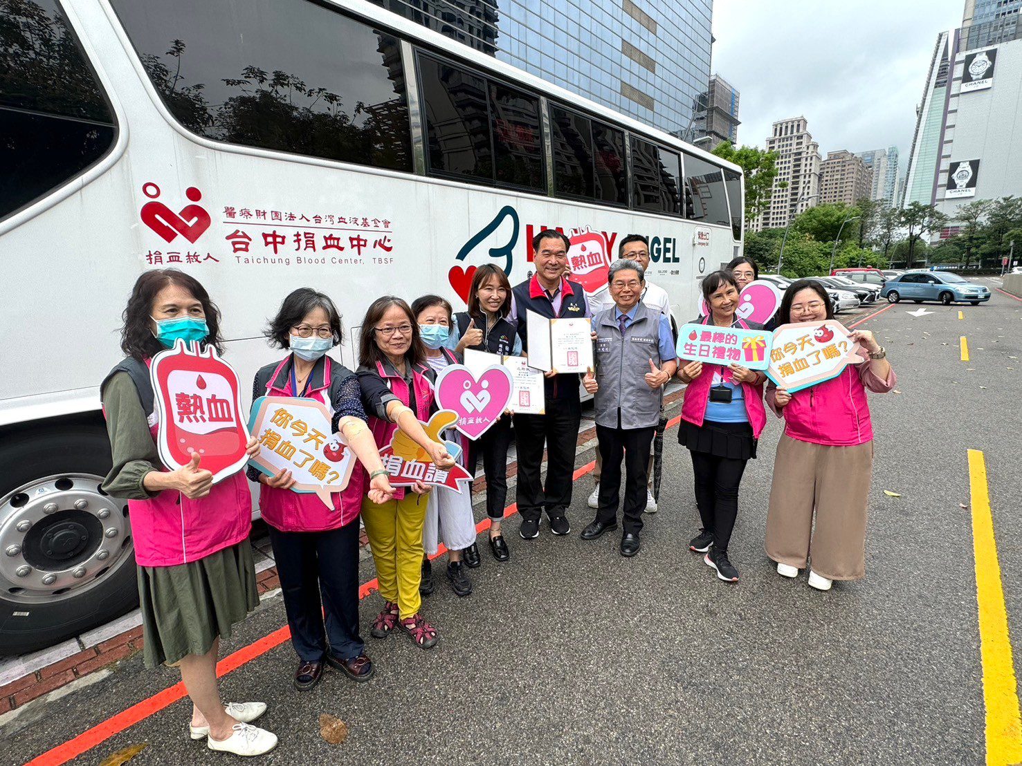 為充裕血庫、解決醫療用血短缺情形,台中市政府與醫療財團法人台灣血液基金會台中捐血中心今(26)日在台灣大道市政大樓府前廣場旁停車場舉辦公益捐血活動,秘書處志工們熱烈響應,市府同仁也紛紛挽起袖子積極參與,共同挽袖捐熱血。市議員賴義鍠及秘書處長謝佳蓁也到場鼓勵更多人一起「捐熱血」發揮愛心,以實際行動捐血助人。