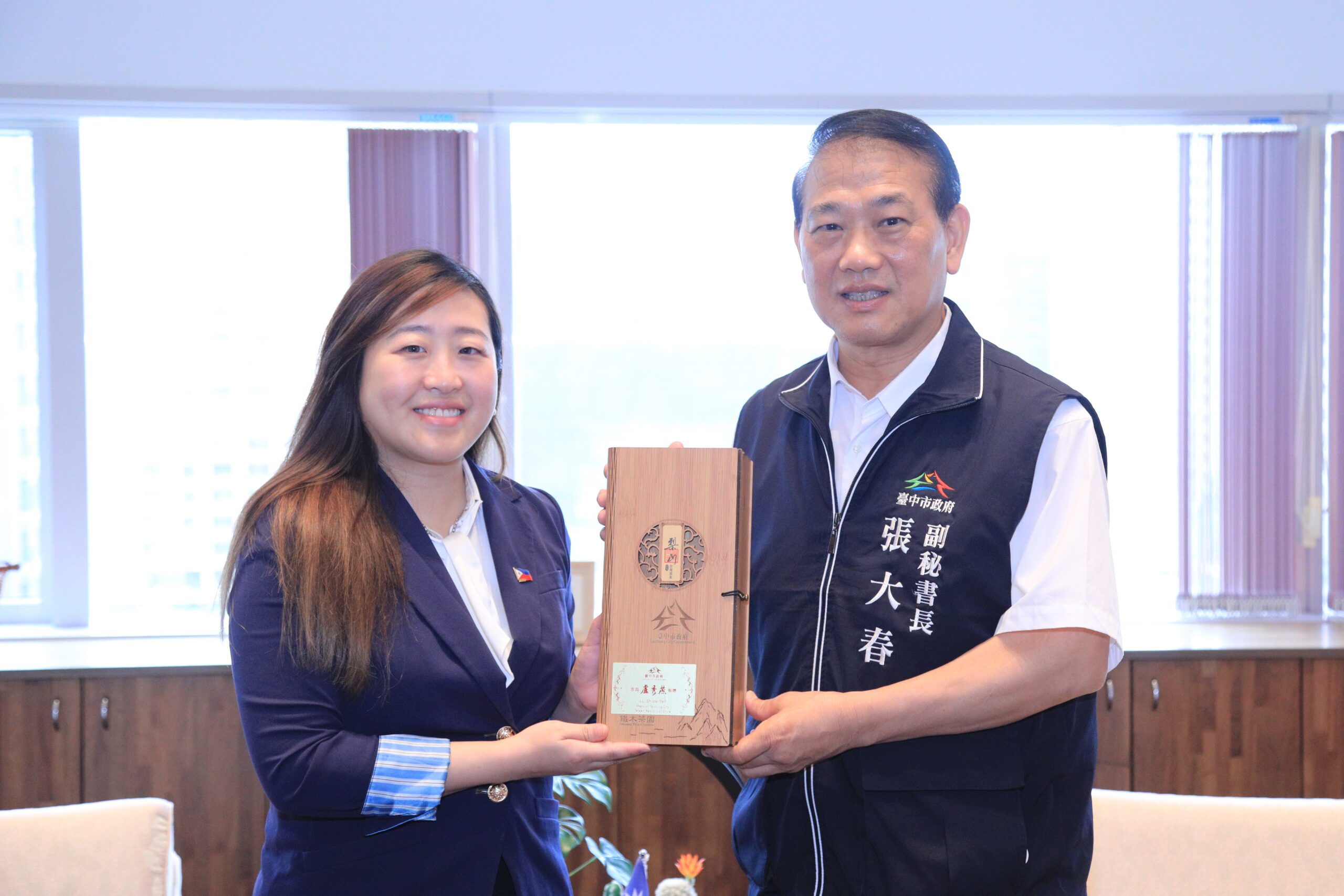 馬尼拉經濟文化辦事處(MECO)台中分處長朱靖雅今(15)日拜會台中市政府,由副秘書長張大春代表市長盧秀燕接待,雙方就勞工、文化、農業等面向交流。張副秘書長表示,目前在台中市的菲籍移工約有1萬7千多人,菲國馬加智市為台中市姊妹市,盼未來雙方可拓展移工及新住民照顧、文化、農業等多面向交流。
