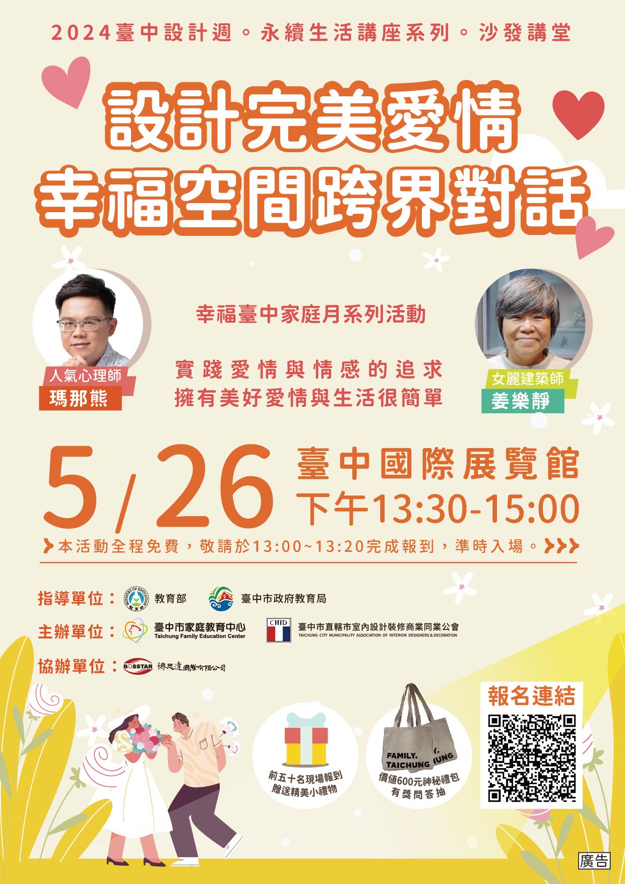 台中市家庭教育中心表示,市府規劃於2024台中設計週「台灣國際建築室內設計建材展」展覽期間,安排此次論壇推動家庭教育,將由人氣心理師瑪那熊的「撩人又聊心,建立好關係」拉開序幕,針對愛情期待的關鍵心態、聊天話題、評估關係指標,幫助民眾與互動對象有機會往婚姻關係發展;接著由建築師姜樂靜講述青年朋友面對邁入婚姻的買房壓力與飼養寵物課題與因應等,最後共同對話交流。