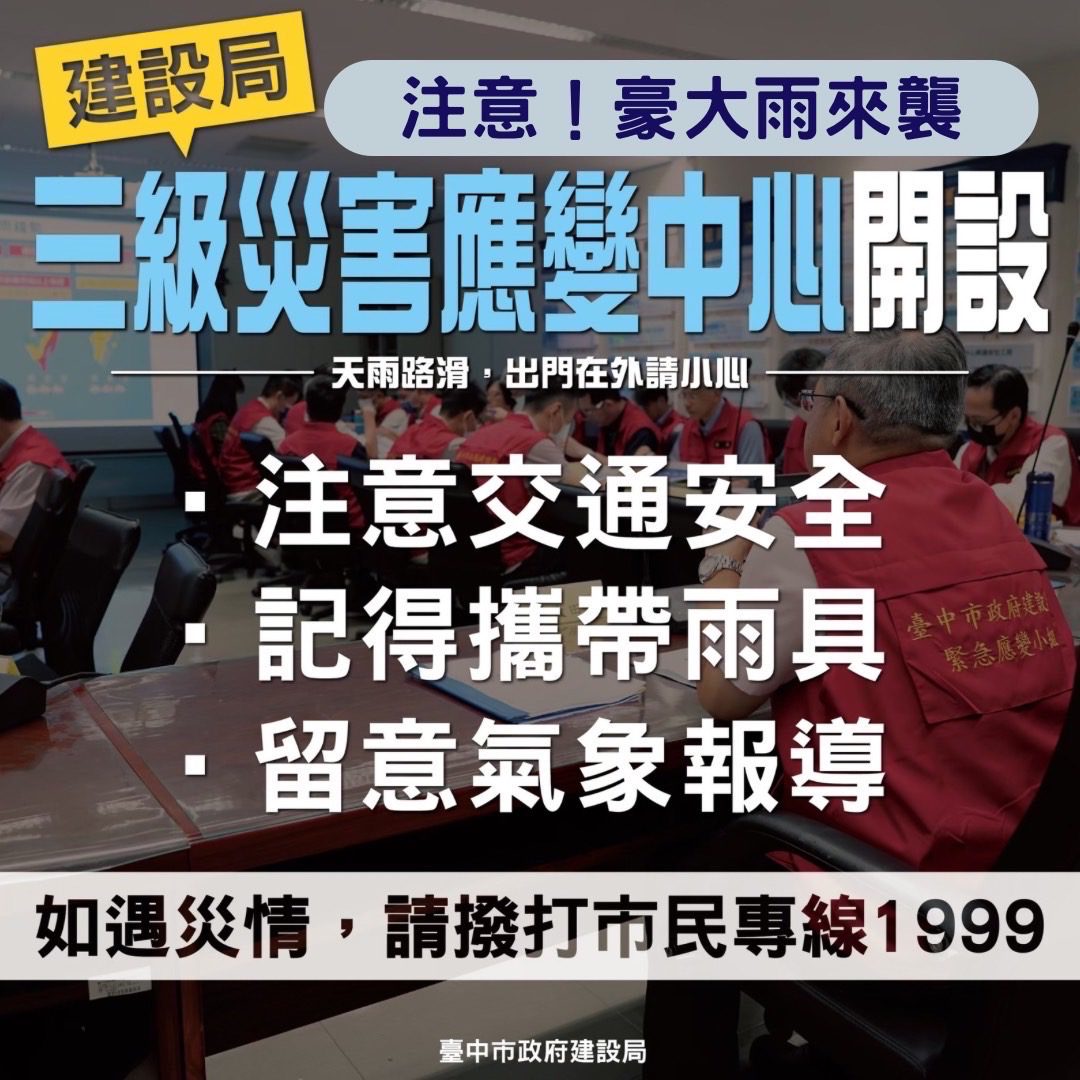 因應梅雨鋒面帶來強大雨勢,台中市政府建設局今(2)日啟動三級緊急災害應變小組,以「守護市民安全」為最優先考量,除派員加強巡守轄內重點道路、橋梁及地下道,並運用監視器及水位偵測等科技設備即時監看,同步建立各區公所災害通報橫向聯繫管道,24小時搶災不打烊,第一線齊心把關市民安全。