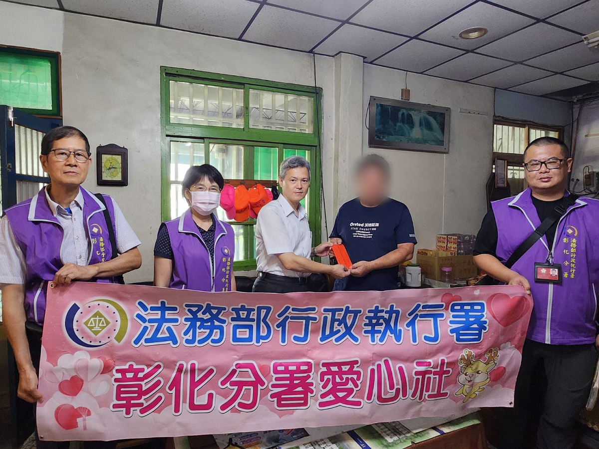 彰化縣鹿港鎮高姓男子因無照駕駛等原因遭處罰鍰新臺幣2萬餘元,逾期未繳納經移送行政執行署彰化分署執行。高男於受扣薪之際,向彰化分署陳情其需要扶養同居年邁的母親及罹患腦瘤的弟弟生活困頓,彰化分署於調查高男生活狀況後除撤銷扣薪命令,彰化分署郭分署長景銘更親率愛心社成員,於端午節前夕至高男住處訪視關懷,並代表愛心社致贈新台幣5,000元表達關心,同時准予分期繳納,讓高男直呼這是他收到最好的「端午節禮物」。