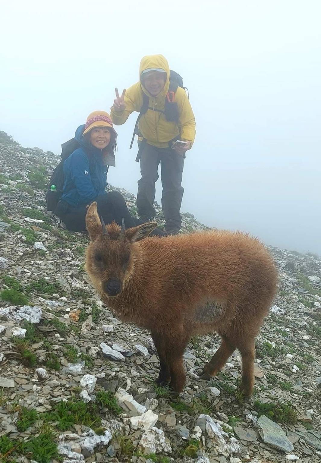 宜蘭縣登山協會一群山友在6月14到16日,前往奇萊北峰登山,沒想到在回程中竟然遇見野生的長鬃山羊,只見這山羊一點也不怕人,還和人近距離拍照,讓登山客是驚喜萬分。