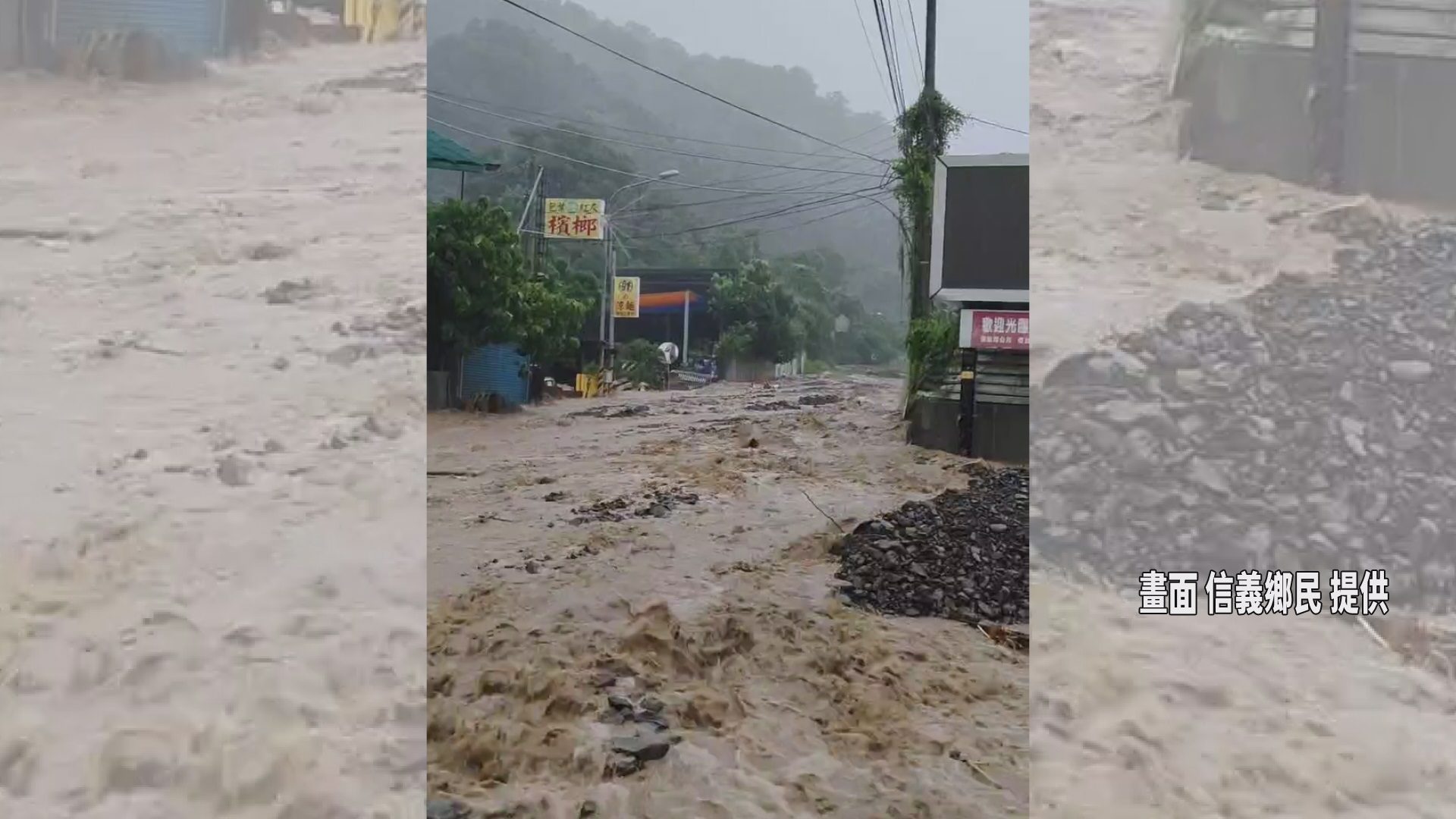 信義鄉許多地區都傳出了坍方與土石流的情形,泥流甚至都淹到了台電服務所,連車輛都難以出動搶修,許多民眾連夜到現在為止都在忙著清理家中沖進的泥土。由於凱米颱風的陸上警報尚未解除,信義鄉目前民生用電並不穩定,自來水的供給也受損出現停水狀態,居民只能引用山區水源來清理家園,目前共99位鄉民受到安置,而信義鄉對外道路無論是台16線與台21線都已道路中斷,請民眾要多加注意。
