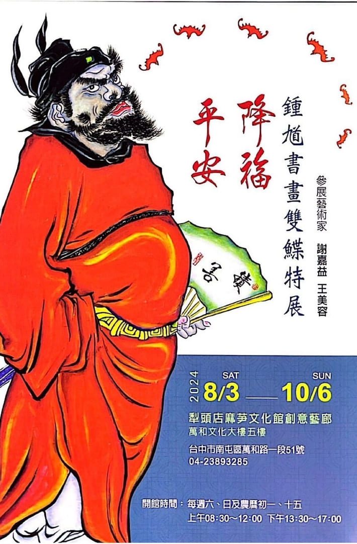 台中市政府消防局第六救災救護大隊黎明分隊分隊長謝嘉益,從小對畫畫特別有興趣,並深受中國道家的歷史文化影響,對神佛打從心底由衷的敬仰;自民國100年開始畫起鍾馗,不僅親朋好友爭相索取,亦常受民間文字書畫協會團體邀請參展。謝分隊長與其夫人王美容老師日前受財團法人台中市萬和文教基金會邀請,將於8月3日至10月6日於犁頭店麻芛文化館創意藝廊舉行夫妻雙聯展「降福平安鍾馗書畫雙鰈特展」,邀請市民朋友及喜愛書法國畫的同好前來欣賞。
