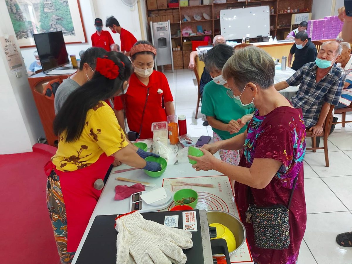 活動開始,長輩學習先將砂糖加入中筋麵粉中,加入豬油及冰水混合均勻製作油皮,低筋麵粉加豬油做成油酥,接著綠豆沙包豬肉燥,再將由油皮包油酥做二次撖捲,將餅皮包內餡,收口搓圓再壓扁,拿竹籤搓氣孔,放上烤盤,用討喜的印章在表面上蓋印記放進烤箱烘烤20分鐘。過程中只見奶奶們大展身手,大家玩得好開心,也比較誰包的較漂亮。等待過程香味不斷飄來,大家引頸翹望、口水都快流出,而後出爐紛紛大快朵頤,楊爺爺高興說:「這豆沙很清香,香氣四溢又不會太甜,烘焙課真是太棒了! 」