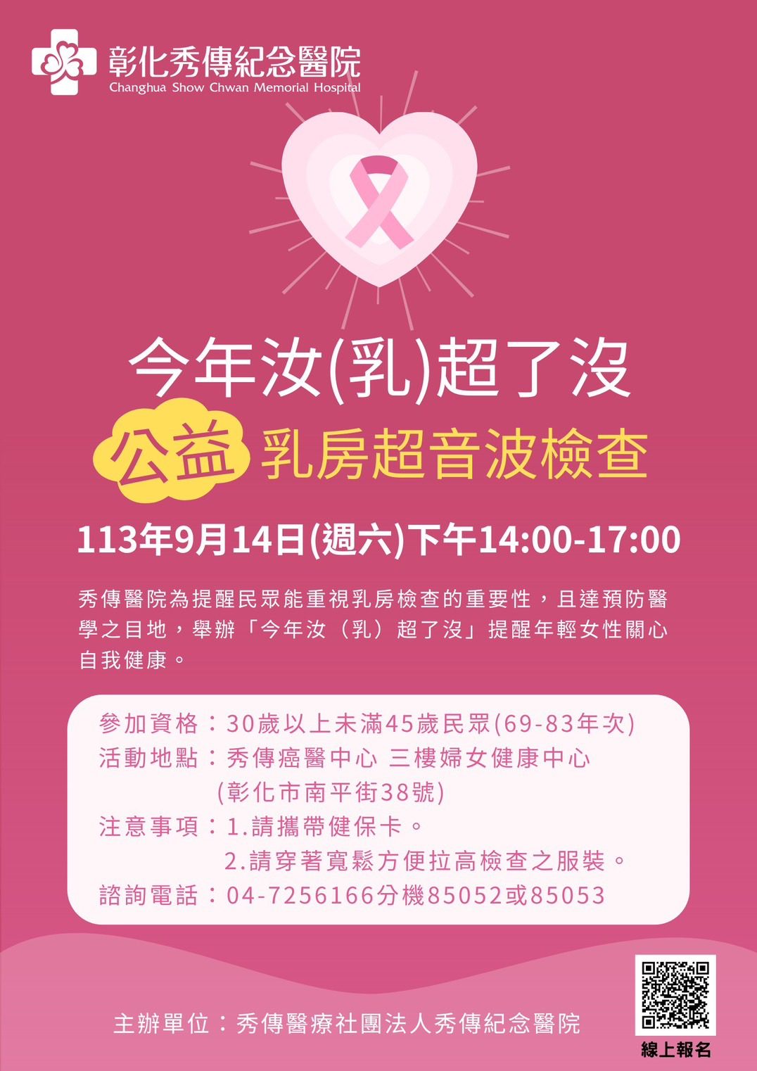 ▲秀傳醫院將於9月14日舉辦「今年汝(乳)超了沒」乳房超音波公益篩檢活動。(圖/秀傳醫院提供)