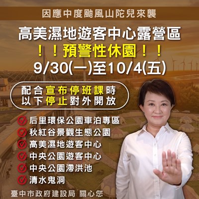 此外,市府建設團隊各項重大工程,如台中巨蛋、東豐快速道路、市政路打通延伸工程、大肚和美大橋等,皆導入智慧監測系統及水位偵測器,即時監控各項設施的情形並可即時因應處置。為保障遊客安全性,高美濕地露營區自9/30-10/4預警性休園,如遇停班課時其他服務場所亦停止對外開放,建設局團隊同仁將配合市府災害應變中心開設24小時待命輪值,並同步通知各區公所加強轄內重點道路橋樑及地下道安全巡守作業,守護市民安全。