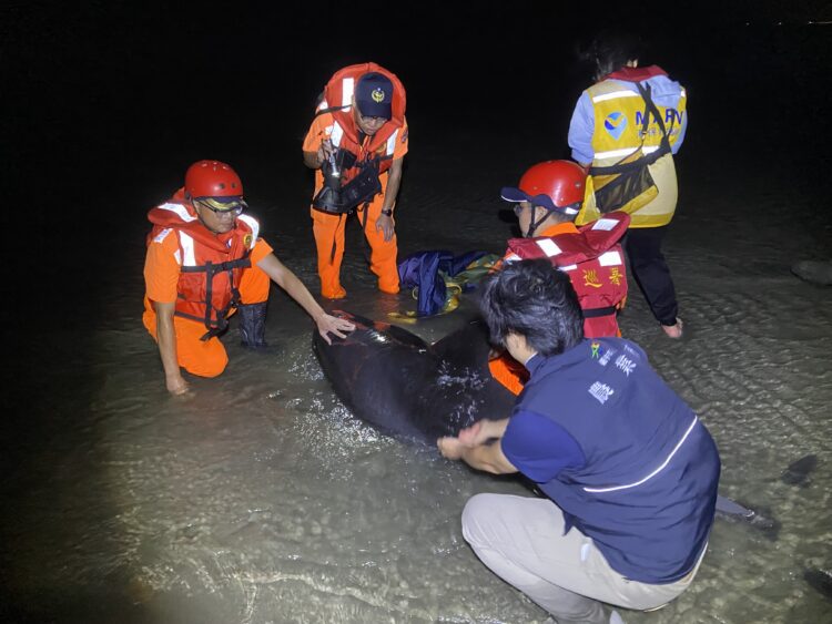 遺憾的是,另2隻個體虛弱身體狀況不佳,評估後其中1隻顧及動物福利由獸醫師現場進行人道處置,另1隻則因擱淺地點受潮汐影響,周邊迅速被潮水覆蓋,又夜間視線不佳,為確保救援人員安全,停止後續救援及處置。