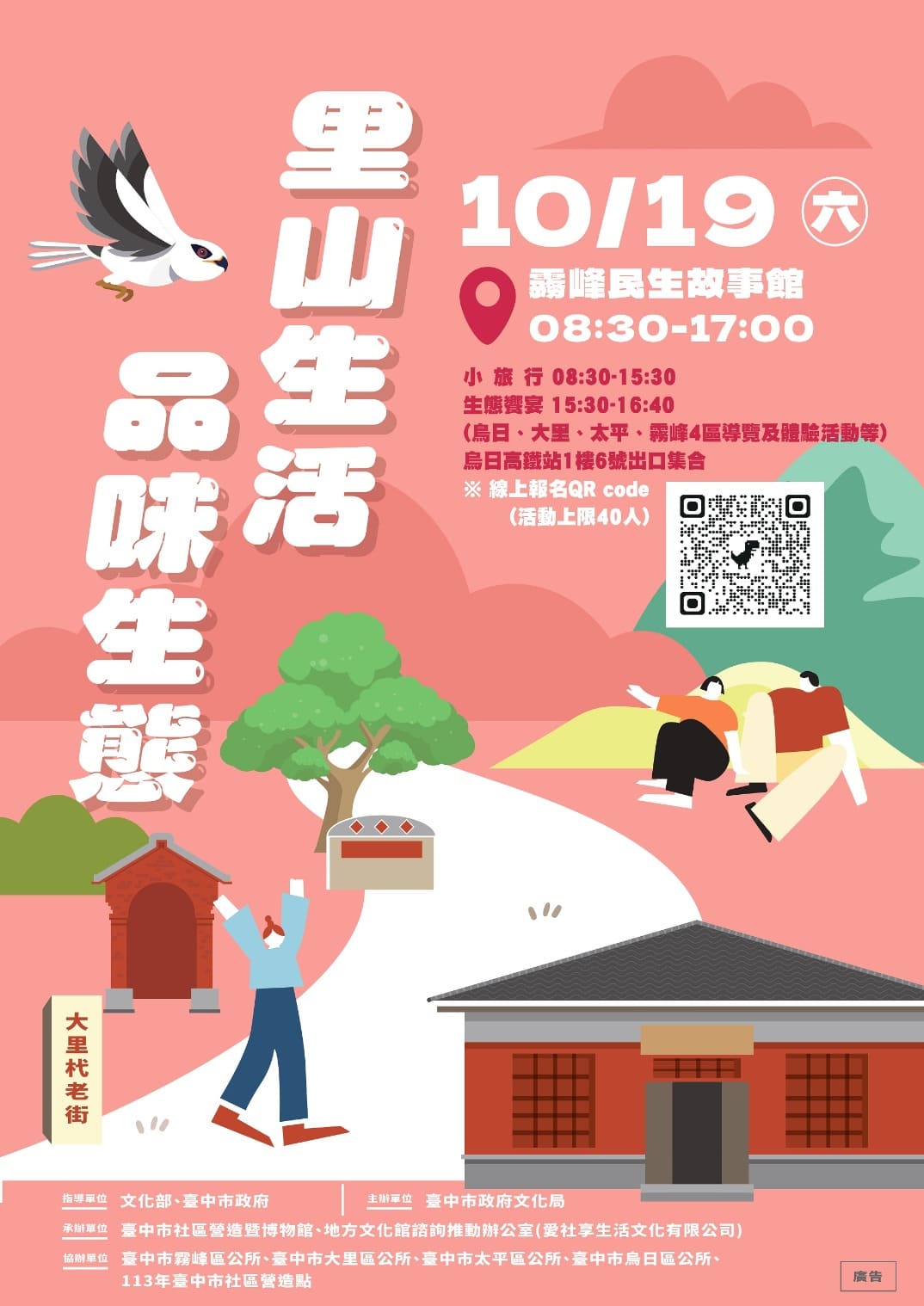 文化局說明,首場19日區域型成果展,以「里山生活.品味生態」作為屯區主題,由大里、太平、烏日及霧峰等4區公所共同規劃,邀請大家一同體驗手作DIY、探索地方文化館及參加導覽認識地方生態,接著享用在地特色料理,有吃有玩,讓大小朋友在活動中能充分感受屯區的「在地知識」、「生態永續」與「食農教育」等地方文化主題。
