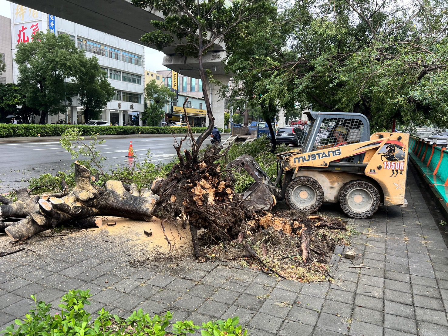 建設局表示,康芮颱風造成台中市多處樹木倒塌,建設局於風災期間即出動機具453車次進行搶災作業,針對樹木傾倒影響交通部分,優先移往路側排除路障占用,後續再安排機具陸續進場清理斷枝及載運倒樹,以提升救災效率,縮短交通影響時間。另於山海屯市區共選定5處臨時暫置場,供斷裂枝葉存放,降低現場裁切作業耗時占用道路情形,加速恢復道路通行,保障正常上班上課車流安全。