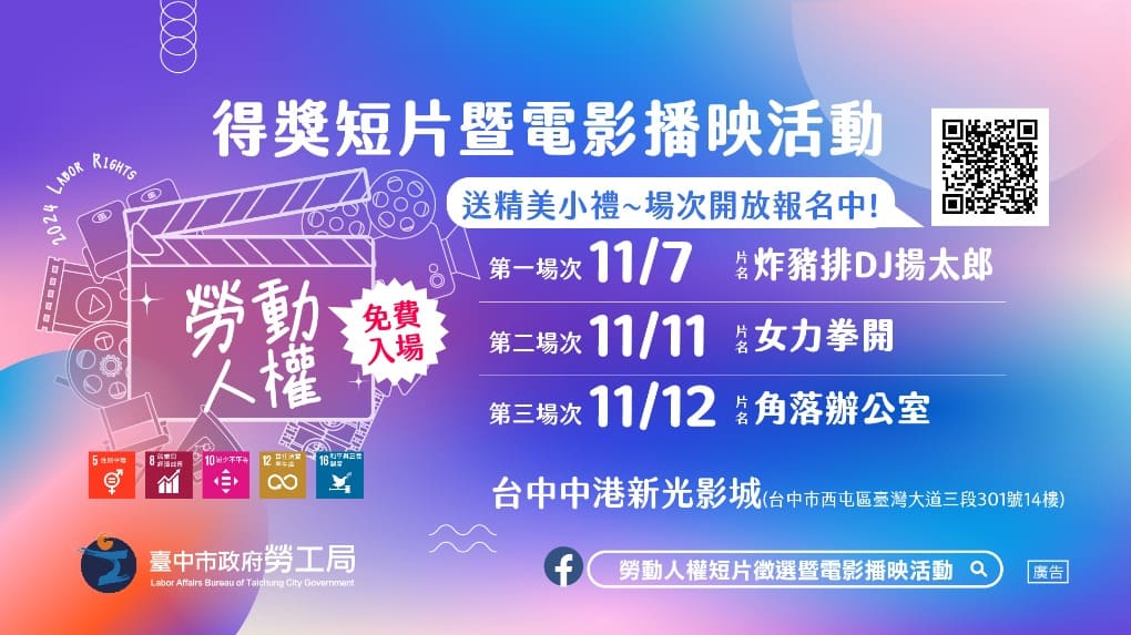 為增進社會大眾對勞動議題、勞動法令的關注,並促進職場平權、加強性別平等工作觀念,台中市政府勞工局特舉辦「113年度勞動人權電影播映活動」,邀請民眾一同來觀賞電影。此次活動共計3個場次,分別於今年11月7、11、 12日於台中中港新光影城播映「炸豬排 DJ 揚太郎」、「女力拳開」及「角落辦公室」3部與勞動人權議題相關電影,並於電影正片開始前播映今年勞工局短片徵選活動社會組首獎作品「什麼老闆都有」及學生組首獎作品「勞工的七大不合理事件」,每場次開放200位民眾報名。