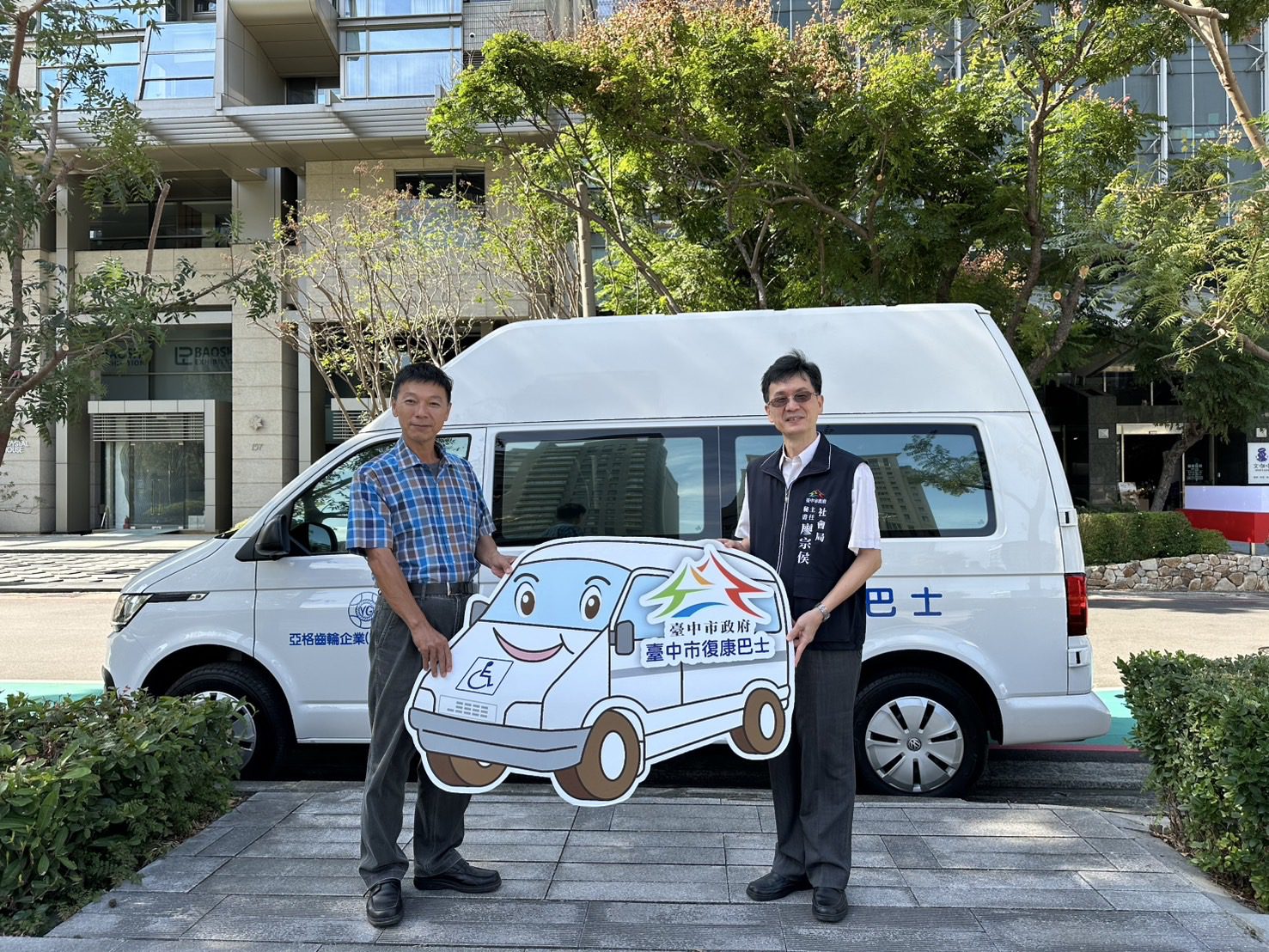 回饋地方鄉里,落實企業社會責任,亞格齒輪企業股份有限公司今(11)日捐贈台中市政府1輛高頂復康巴士,由社會局主任秘書廖宗侯代表受贈。廖主秘感謝企業行善不遺餘力,自107年以來已經捐贈4輛復康巴士,造福身心障礙朋友,方便就醫、復健等交通接送,增加社會參與。