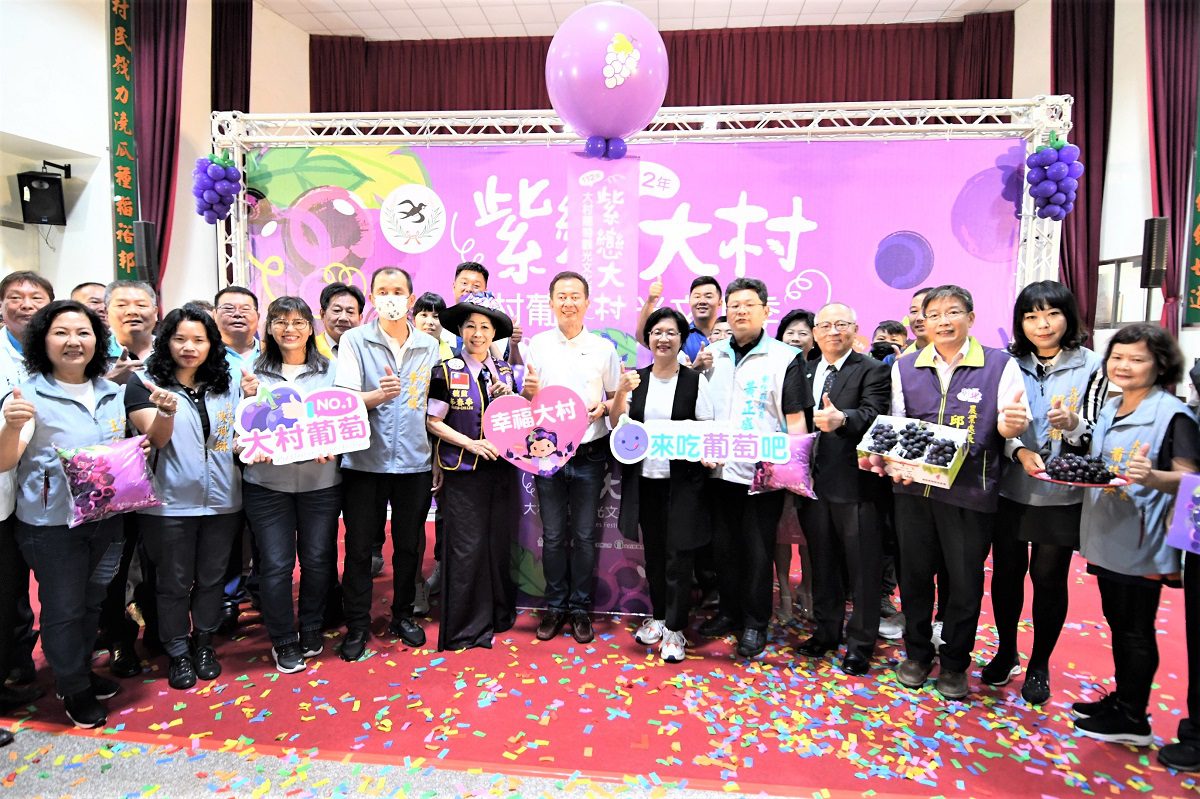 由彰化縣大村鄉公所舉辦「112年紫戀大村-大村葡萄觀光文化季」30日上午宣傳記者會,縣長王惠美應邀出席,大村鄉長賴志銘等人與會,共同邀請全國鄉親一起來參與,歡迎大家來採買彰化最優質的葡萄、吃著由葡萄入菜的割稻飯饗宴,欣賞好聽的金曲音樂,王惠美表示,平均每2顆葡萄就有1顆來自彰化,每年5-8月是葡萄成熟時,這裡的葡萄Q彈有勁,好吃又甜,歡迎大家多來訂葡萄、吃葡萄。