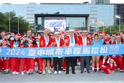 「2024第六屆台中城市半程馬拉松」今(8)日在台中市政府前廣場盛大登場,來自全國各地逾2萬名跑者參加,副市長鄭照新換上聖誕裝代表市長盧秀燕到場響應,不僅親自領跑為跑友打氣,亦感謝主辦單位台中市不動產開發商業同業公會理事長林正雄與帶領的團隊,以企業力量響應環保、結合運動回饋社會,打造屬於城市品牌的馬拉松賽事,提升台中路跑風氣。