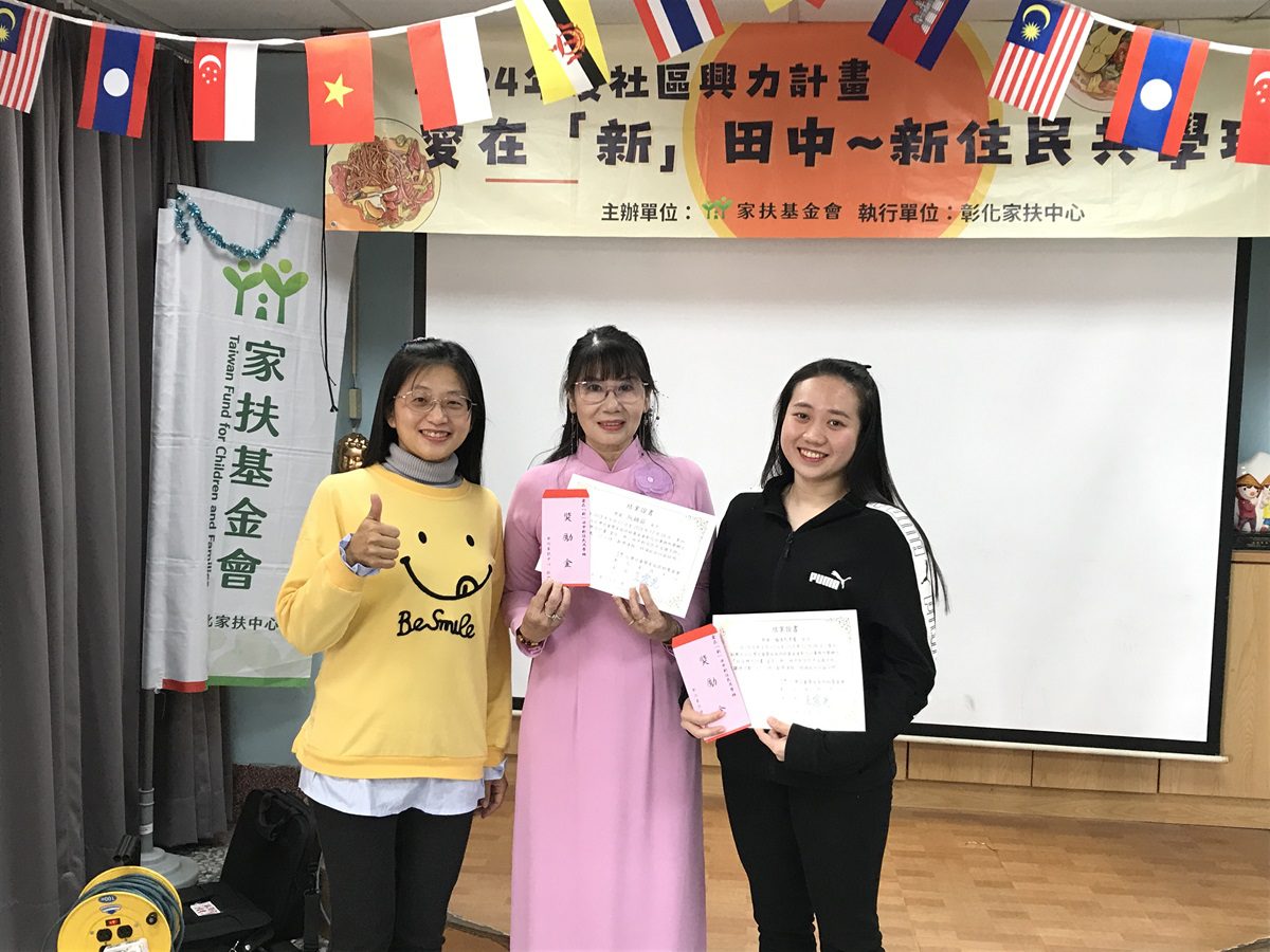 經過近8個月的學習互動與交流,彰化家扶在12/28(六)於田中服務處二樓舉辦「愛在新田中-新住民共學班成果分享會」,分享會上邀請新住民姐妹們述說自身學習中文的動機,以及學習後的轉變,也頒發結業證明與學習獎勵金,鼓勵她們延續學習,還設計了一場台灣囝仔vs新住民媽媽中文拼音對抗活動,場面相當熱鬧逗趣;靜態展則呈現了越南斗笠彩繪、田中走讀地圖、姊妹們的中文練習簿,新住民姊妹們為感謝家扶中心這段時間提供她們免費學習的資源,也親手製作東南亞點心與來賓進行美食文化的交流。