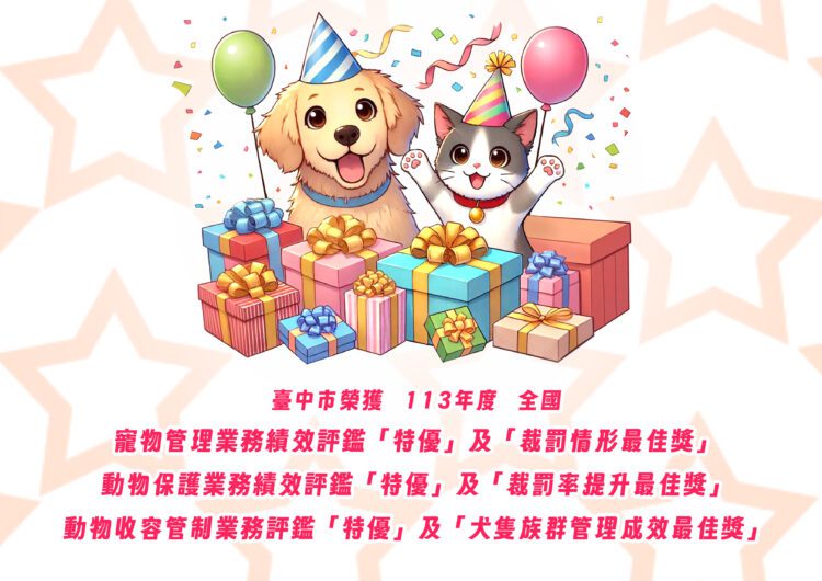 農業部辦理113年度「全國動物保護業務績效評鑑」、「全國寵物管理業務績效評鑑」及「全國動物收容管制業務評鑑」,台中市脫穎而出,三項評鑑皆獲得「特優」,同時在各評鑑特別獎項獲得「裁罰率提升獎」、「裁罰情形獎」及「犬隻族群管理成效獎」三項最佳獎!台中市政府動物保護防疫處表示,感謝中市動物保護諮詢委員、動物保護團體、獸醫師公會、寵物商業同業公會、公益商家、諸多默默奉獻的動保志工及臨床獸醫師等夥伴相助,攜手以超群行動力打造人寵宜居的友善城市。