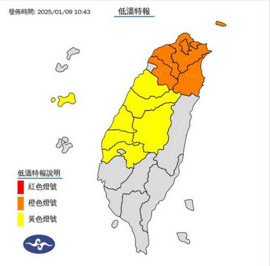 氣象資料顯示,受強烈大陸冷氣團影響,各地氣溫明顯偏低,從9日晚間一直到10日新竹以北及宜蘭局部地區,會有持續10度左右或以下的氣溫(橙色燈號)。橙色、黃色低溫區域如下: