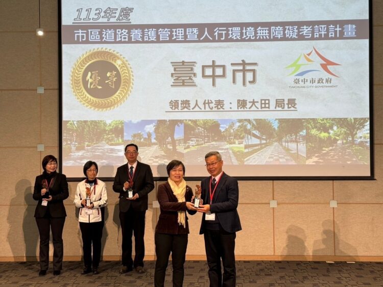 內政部國土管理署昨(21)日舉辦113年度「市區道路養護管理暨人行環境無障礙考評計畫」暨「共同管道建設考評計畫」頒獎典禮,此次台中市脫穎而出,共榮獲7項大獎,包括總成績「優等」及人行環境考評第一名、政策作為考評第二名,更獲頒進步獎及提報三位里長皆獲獎殊榮,市府由建設局長陳大田代表市長盧秀燕出席頒獎典禮,亮眼成果再度彰顯台中市在人本友善環境建設上的卓越表現與持續努力。