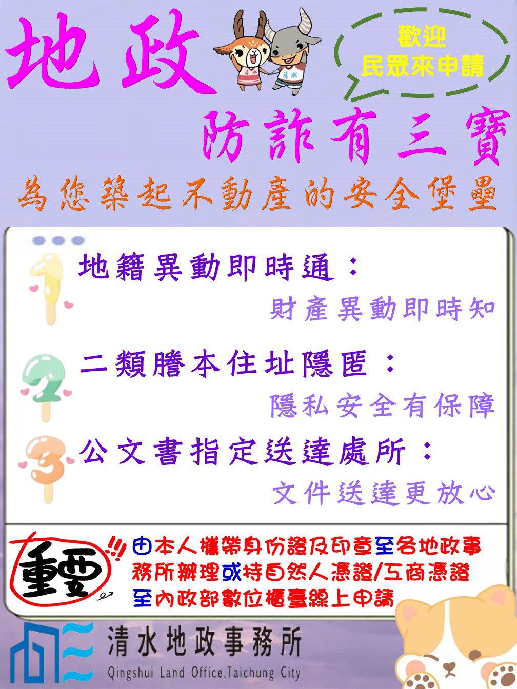 清水地政事務所主任吳金昇說明,保護市民財產安全是首要任務,呼籲市民朋友在處理地政相關交易或簽署文件時應保持警惕,並善用官方資源以確保財產權益,將「防詐三寶」化為日常防護網,共同打造安全的財產環境。 民眾可至清水地政事務所或全市任一地政事務所洽詢並臨櫃辦理。此外,亦可持自然人憑證登入內政部數位櫃台網站,在家輕鬆申請,提升使用便利性。如欲了解更多資訊,可洽詢台中市清水地政事務所(04-26237141)或上內政部數位櫃檯網站查詢(https://dc.land.moi.gov.tw)。(3/15*12)*地政局
