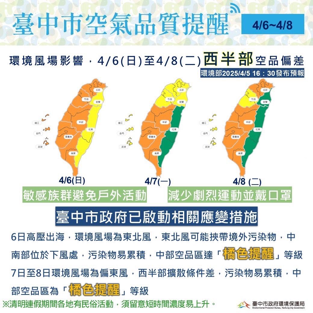 依環境部及中央氣象署預報資料顯示,明(6)日起受高壓出海影響,東北風可能挾帶境外污染物影響台灣及離島,後續環境風場將轉東風,未來三日中部地區空品仍有達「橘色提醒」等級之虞,指標污染物為「臭氧八小時」及「細懸浮微粒」;環保無假期,台中市政府持續啟動應變措施並監控空氣品質狀況,也提醒敏感族群留意空品變化,外出請做好防護措施。