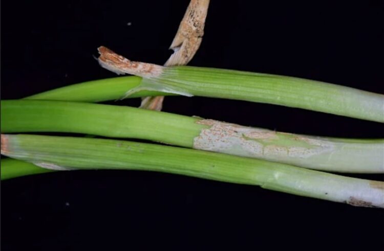 青蔥表面可見炭疽病菌之橘紅色孢子團構造。(圖/臺中農改場提供)