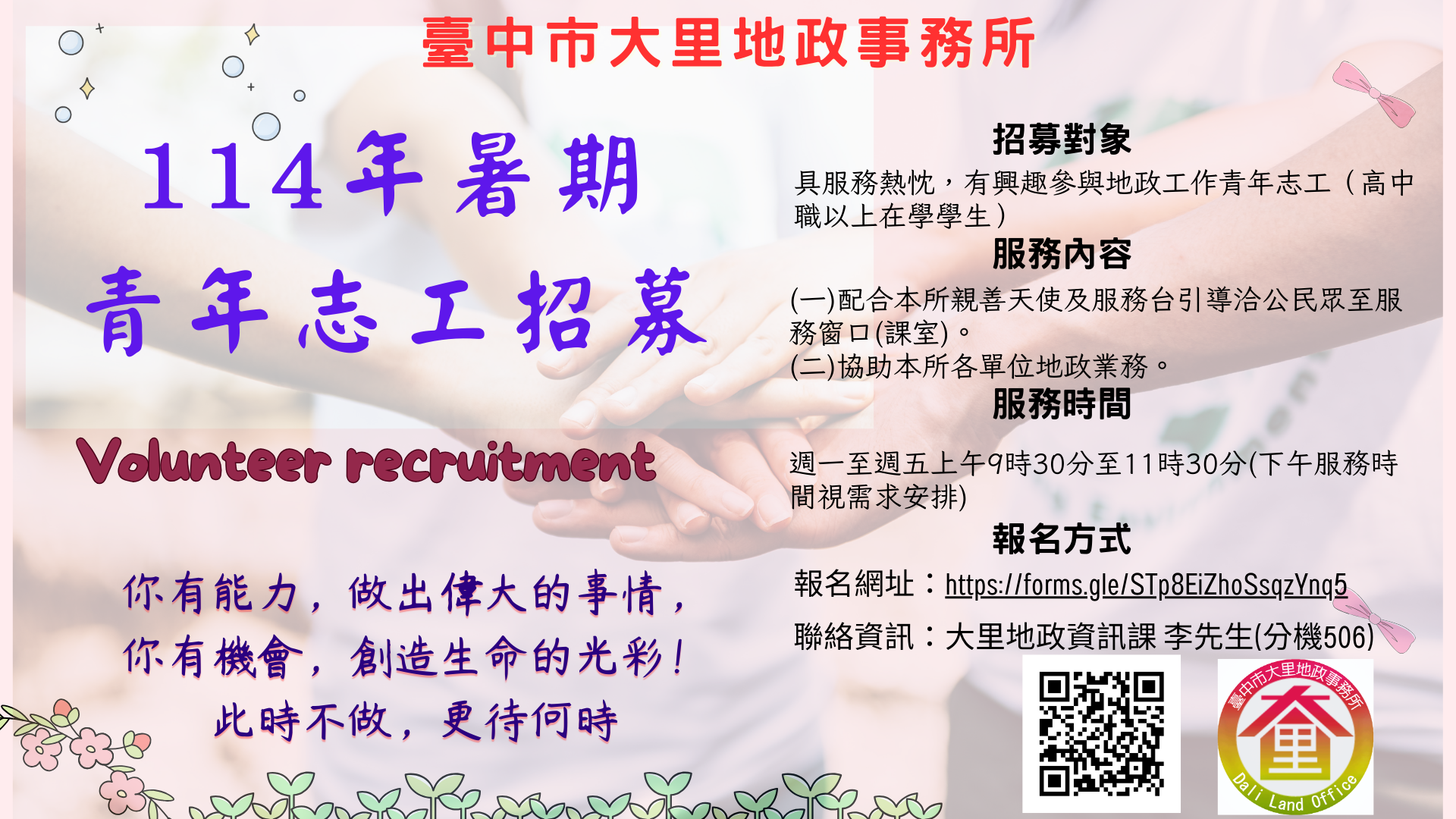 大里地政事務所主任施宏昌指出,青年志工來自不同學校與成長背景,進駐機關後帶來多元觀點與青春活力,讓民眾在洽辦業務的同時,也能感受到年輕世代的熱忱與用心。透過這樣的社會參與,不僅有助於青年認識公部門運作,也促進自我成長與價值實踐。歡迎有意參與的學生踴躍報名,只要填寫報名表單(https://forms.gle/STp8EiZhoSsqzYnq5),或洽承辦人李先生,電話04-24818870 分機506,一起用行動點亮這個夏天。(5/24*6)*地政局