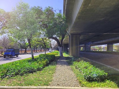 建設局長陳大田表示,市府自109年起推動高架橋下空間綠美化,透過分階段施作,已在北屯、太平、大里、西屯等區域完成多處綠化工程。其中,與台積電合作4年來已完成西屯區及南屯區(朝馬路至新鎮和路) 兩側快慢車道分隔島綠化工程案,目前第五期「環中路二段(凱旋路-僑大六街)」預計今年10月進場種植。