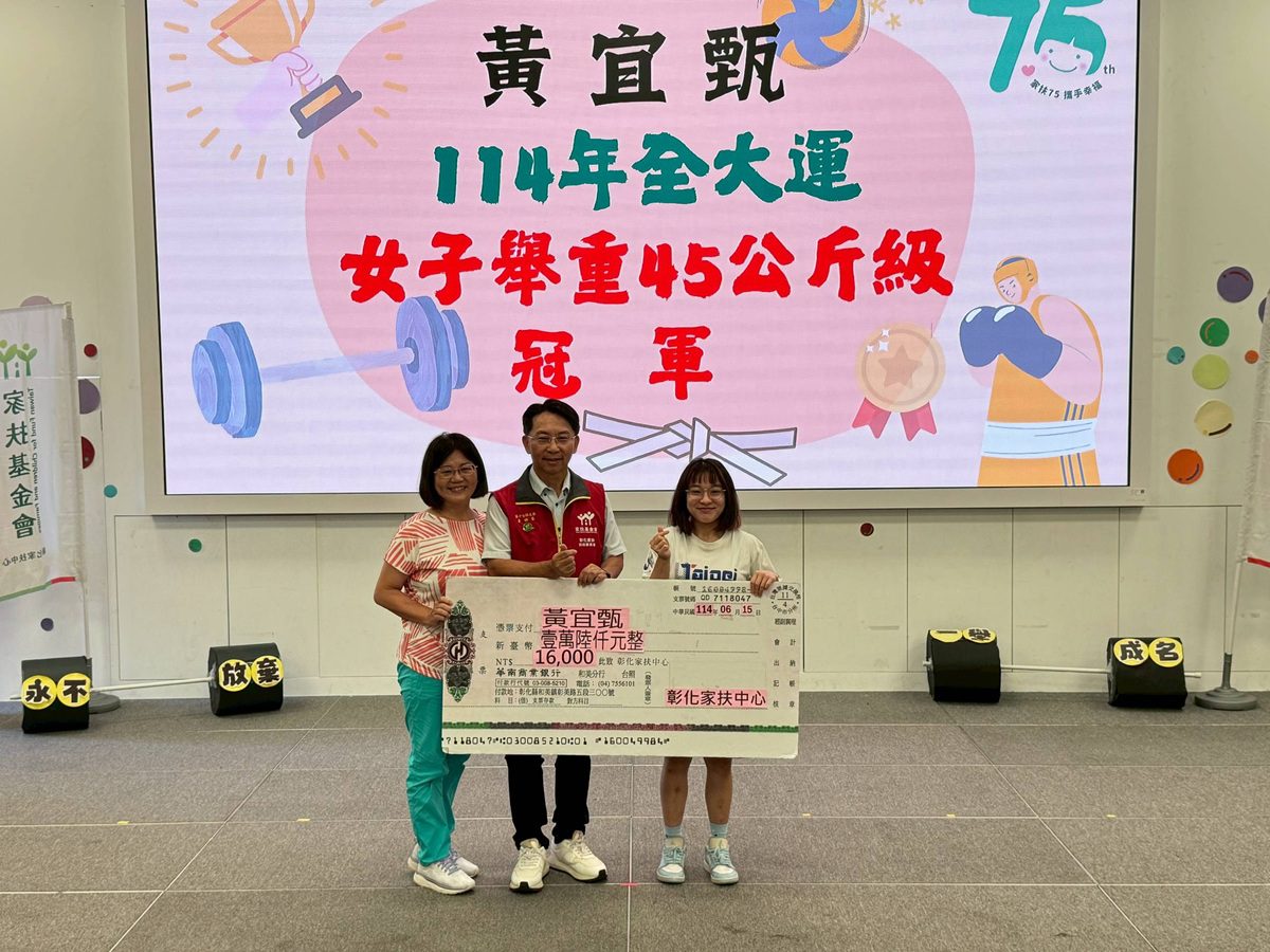 家住社頭鄉的黃宜甄,自小父母離異,由父親一人獨力扶養長大,家中五口成員,全依靠父親一人維持生計,但數年前父親在罹癌後離職療養,家庭經濟陷入困頓,僅能依靠扶助及社會資源度日。宜甄自國中起開始接觸舉重,並逐漸對這項運動產生興趣,過程中也曾數次感到疲憊想放棄,但一想到家庭的需求,就有了繼續堅持下去的動力,從國中到大學,透過一次次不斷努力訓練持續精進個人能力,終於在今年的全大運賽場上,以堅強的實力奪下冠軍,更是一舉打破全國及大會紀錄,宜甄也特別感謝一路上支持他的家人,同時她也感謝教練的陪伴與指導,讓宜甄可以不負眾望,奪得冠軍,未來宜甄想挑戰更高層級的國內外賽事,為台灣與家人爭光,更希望自己能成為弱勢孩子的榜樣,鼓勵他們透過自己的力量改變未來。