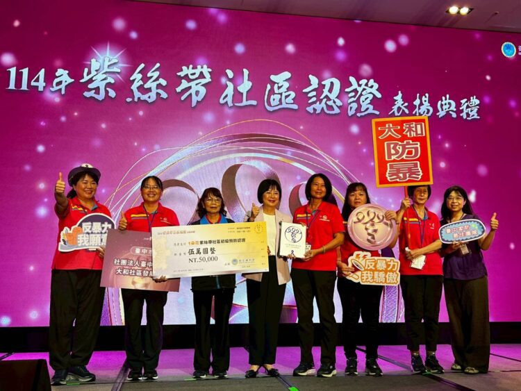 另外,獲得1朵紫絲帶認證的3個社區中,台中市豐原區鎌村社區發展協會在日常生活與在地文化融入防暴觀念;透過節慶活動、產業導覽及跨齡合作,打造在地的社區防暴模式。以國樂、戲劇與手語演出,引導居民以自身經驗轉化為教育能量,提升識暴、說暴、止暴的能力,讓每個人都能成為守護家園的一份子。