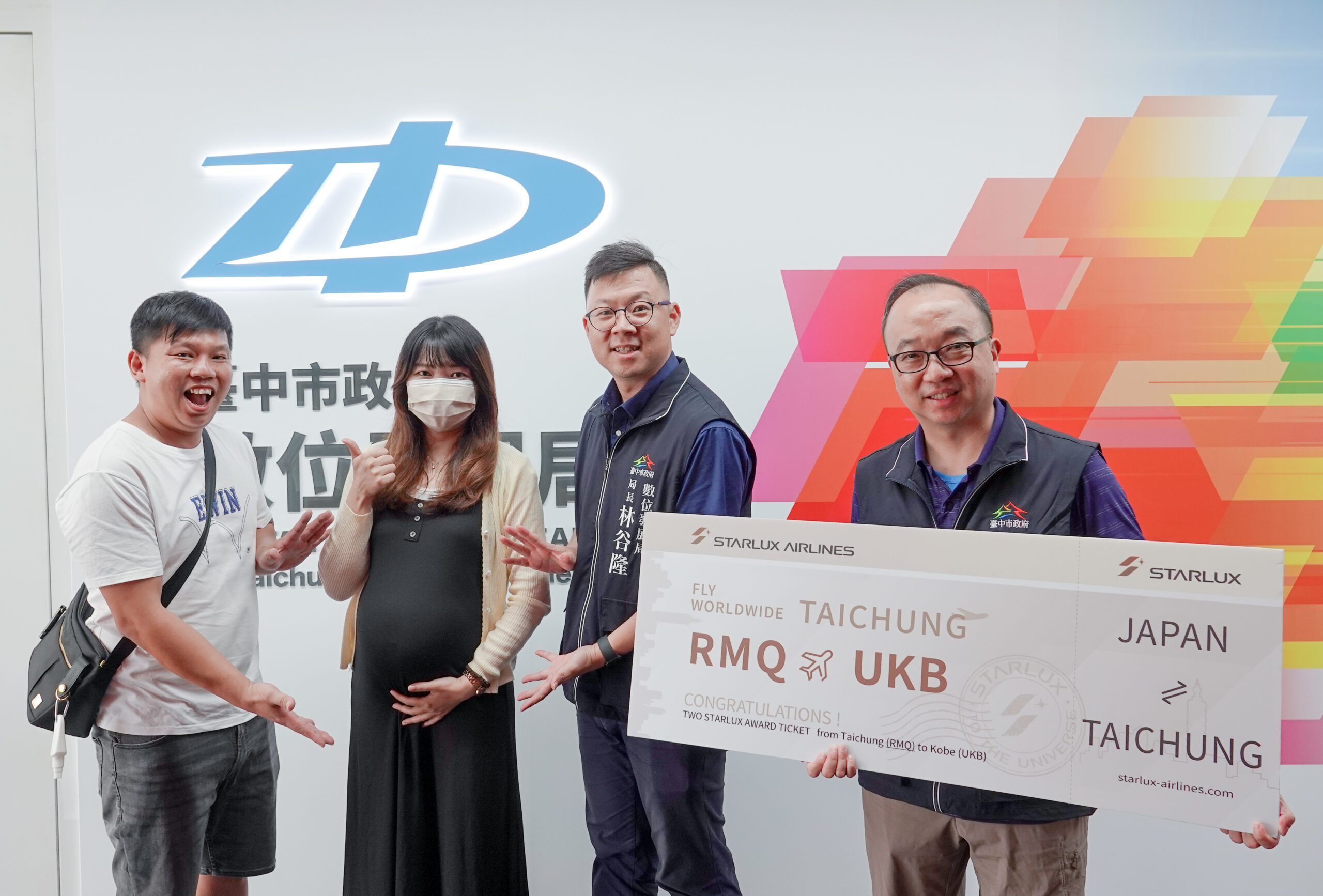 得主之一的黃小姐來自大里區,是個年輕的孕媽媽,得知中獎後非常驚喜,直呼雙喜臨門!黃小姐表示,她原本只是透過「漾台中」粉絲專頁得知活動訊息,沒想到真的幸運中獎,接獲通知時非常驚訝,不敢相信自己真的幸運抽中商務艙機票,加上肚子裡的寶寶,根本是喜上加喜!這將是她人生第一次搭乘商務艙,計畫明年與先生及兩個孩子一同前往神戶渡假,非常開心又期待。