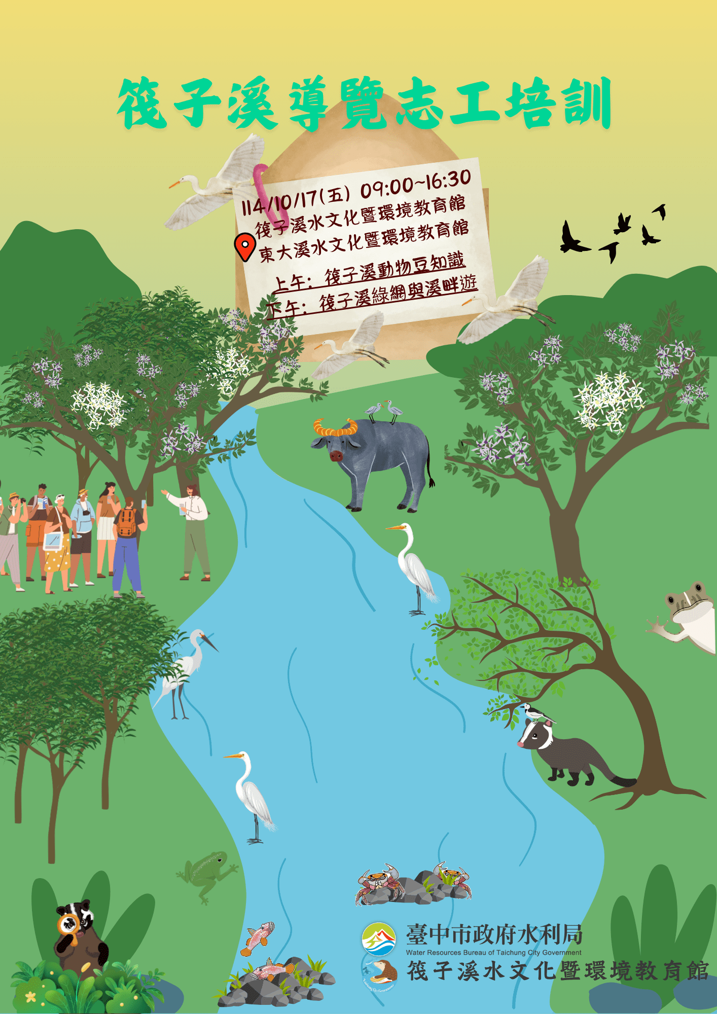 台中市政府水利局持續推動環境教育與生態保護,將於10月17日舉辦「筏子溪水文化暨環境教育館志工訓練」。此次課程融合生態導覽、戶外實作與動物知識,期望培育更多具備專業解說能力的志工,未來投入館內外解說服務,帶領市民深入認識筏子溪自然生態與整治成果,共同守護這條象徵台中意義深遠的母親之河。