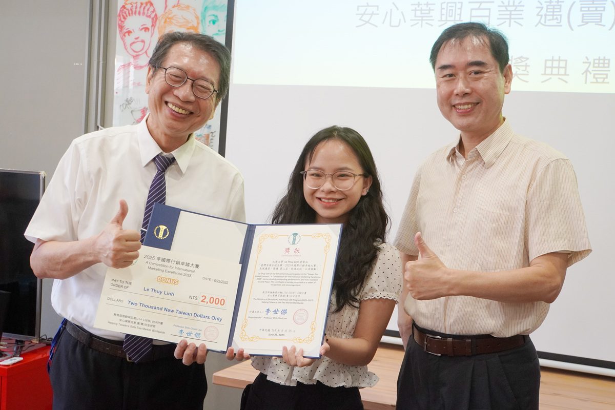 第二名的商業經營國際碩士學位學程學生Le Thuy Linh針對越南市場,強調運用數位行銷與線下體驗活動相結合,打造台灣茶品牌的在地認同感,透過社群媒體精準投放健康與生活風格內容,並結合品茶活動與文化講座,提升消費者黏著度。設計了多元包裝與推廣策略,特別關注年輕消費者及高端茶飲市場,期望透過差異化產品與創新體驗,提升台灣茶在東南亞市場的影響力。