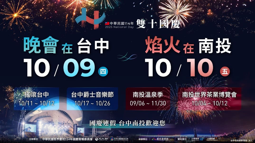 中華民國114年國慶盛宴即將到來!台中市與南投縣日前舉行國慶記者會,宣布「雙城國慶」正式啟動,從精采萬分的雙十晚會與浪漫焰火開始,接著也將迎來四大精彩活動。其中包含深受年輕人喜愛的最大城市音樂節「搖滾台中」,高質感藝文盛事「台中爵士音樂節」,以及多元茶文化的「南投世界茶業博覽會」,還有「南投溫泉季」也以豐富自然資源與獨特山城魅力呼應國慶喜悅。台中與南投藉由雙城合作,邀請大家於國慶連假期間走入中台灣,感受節慶氛圍與在地風情。