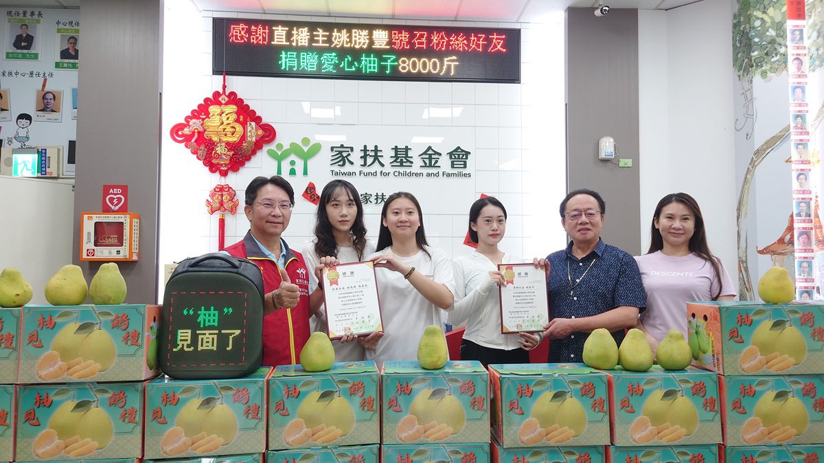 直播主姚勝豐「豐哥」表示:助貧童,看見改變的未來!下週二就是中秋節,今年台南的文旦柚產區在7月遭到颱風「丹娜絲」的強風侵襲,導致約八成以上的文旦果實被吹落因颱風侵襲,故今年柚子除了價格不斐,產量更是減少許多!對於許多弱勢家庭而言,這份甜蜜的期盼是奢侈更是遙不可及。但是我們做到了,謝謝我連續多年響應的「老戰友」及「新血」加入:感謝勝豐水晶國際有限公司、香水人生黃晉旭、珍香甜水果專賣店、西瓜大王林寬仁、春耕不動產管國安、歐康水晶、夢娜水晶、姚庭芊、李銘鋒、葉津良及李承穎等好友互相相挺,讓我第8年捐贈8000斤愛心柚願望實現!