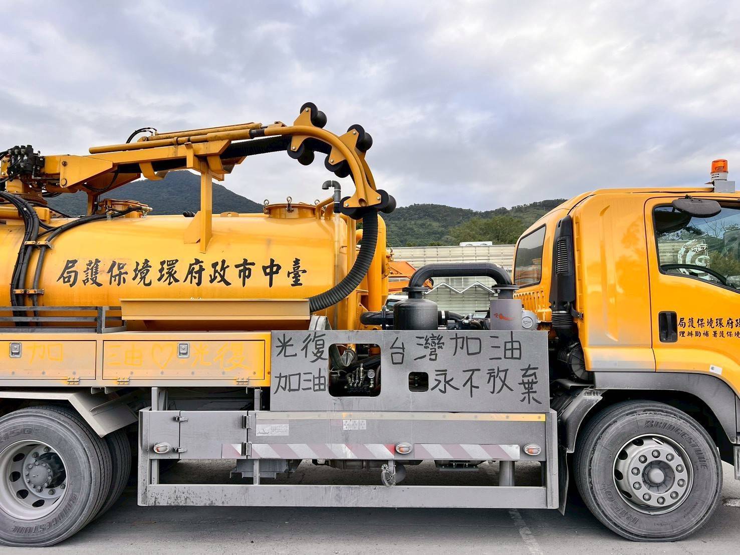 環保局補充說明,現場取水點有限,補水往返耗時,所幸有民間夥伴「鑫友力工程」加入,出動灑水車現場支援,不僅協助民眾取用,也提升整體作業效率。值得一提的是,經過一天與塵土疲累奮戰後,隔天環保局清潔同仁發現挺進協助沖洗民宅的清潔車輛上,有熱心民眾特意在車身灰白塵土上寫下「再大風雨我們都能挺過 ! 光復加油 台灣加油」,令人為之動容,也讓在烈日下奮戰的清潔隊員深受鼓舞。