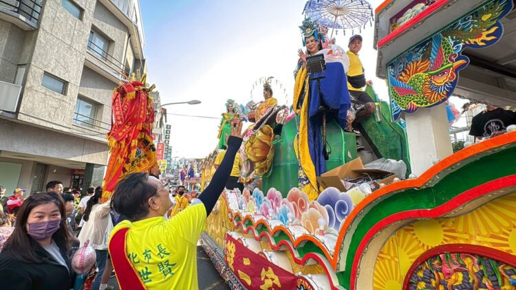 ▲南瑤宮遶境巡角活動主委林世賢市長等人在中華路跪拜開基三媽鑾轎。(圖/彰化市公所提供)