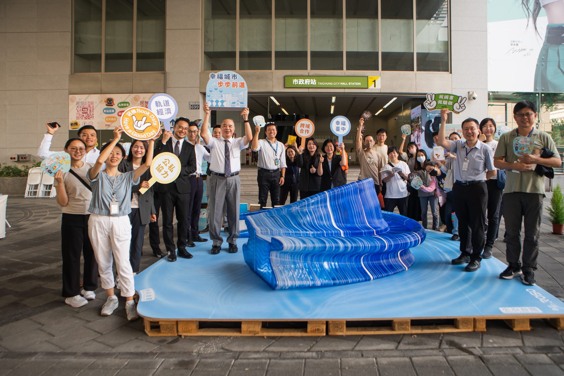 捷工局指出,此次計畫特別邀請逢甲大學建築系副教授盛郁庭率領ROSO機器人建造實驗室共同參與,以可回收、耐候性佳的PETG環保材料結合機器人3D列印技術,打造兼具造型與實用性的公共藝術裝置《書游!水唷》。作品以水波紋理為設計語彙,象徵閱讀帶來的心靈流動與靜謐能量,名稱寓意「書中漫遊」之趣,並融合台灣口語中對美好事物的讚嘆語氣,期望透過趣味而詩意的形式,邀請市民佇足、閱讀、思考,於片刻間獲得放鬆與啟發。