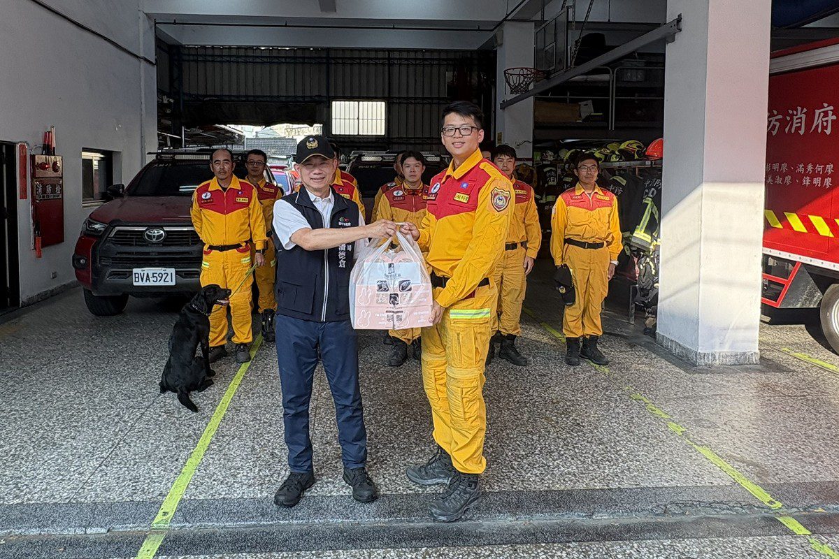 今日特搜隊任務完成平安返隊,由特搜大隊大隊長潘德倉代表迎接,義勇消防總隊西屯分隊及義勇消防總隊搜救分隊也特別頒發加菜金,慰勞特搜隊員們這幾天的辛勞。