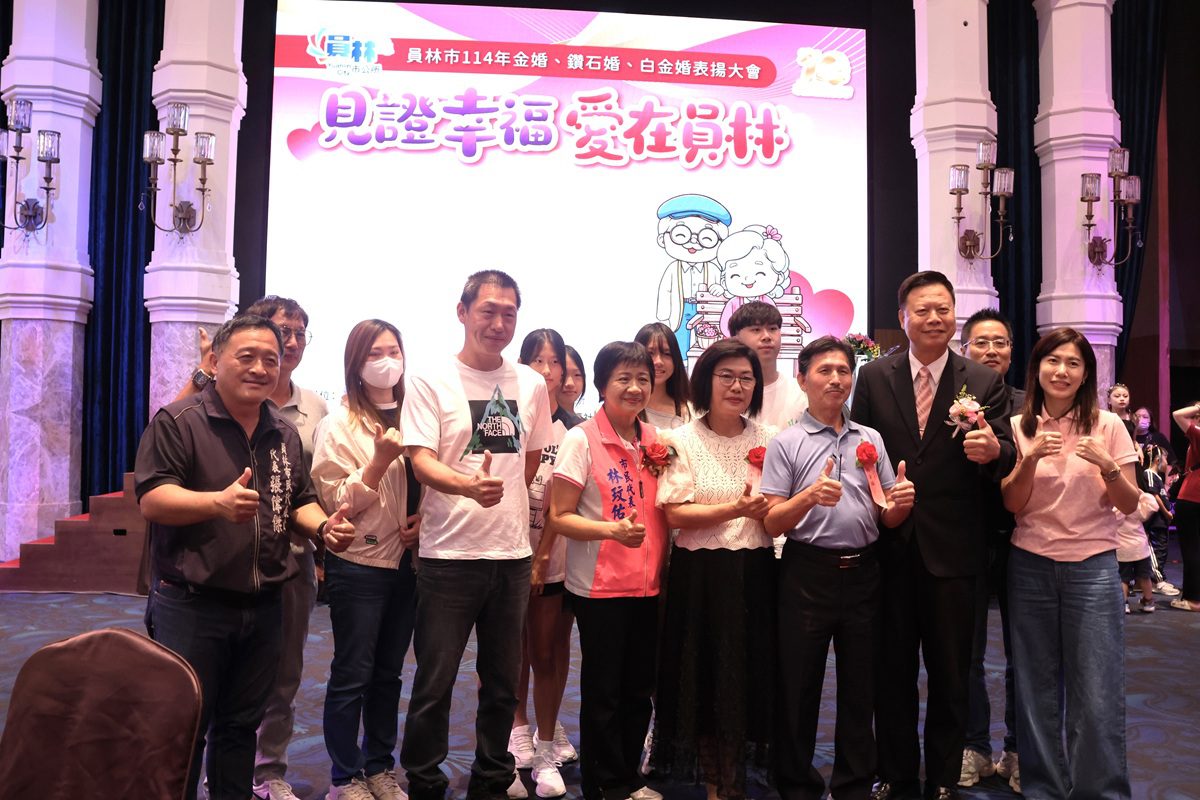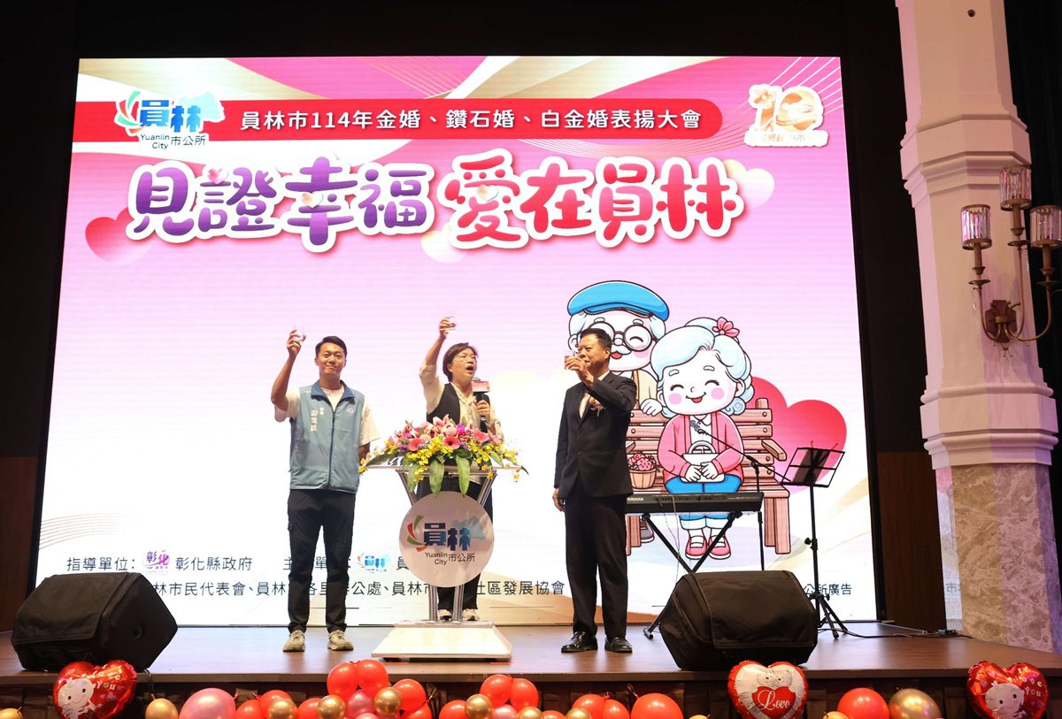 員林市公所今(12)日於皇潮鼎宴禮宴會館舉辦「114年金婚、鑽石婚、白金婚表揚典禮」,今日在員林市代理市長賴致富、彰化縣長王惠美、機要秘書張建豐、參議柯呈枋、秘書賴沛然、游筑凱及工策會總幹事洪榮章,員林市民代表會主席張國良及多位市民代表,彰化縣議員張錦昆、凃俊任、劉惠娟及張欣倩等,以及立法委員、各區里長等嘉賓與地方仕紳來到現場祝賀,共同見證長輩們結縭超過半世紀的婚姻。