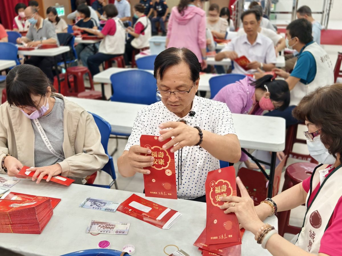 發放禮金的「大工程」,16日一上班,全市73里的里幹事、志工與市公所員工共數百人,群集在彰化生活藝文館點鈔,並將總計15,944,000元現金(含公所與協助縣府代發的)逐一分裝進紅包袋,市長林世賢也特別前往視察並慰問大家辛勞。