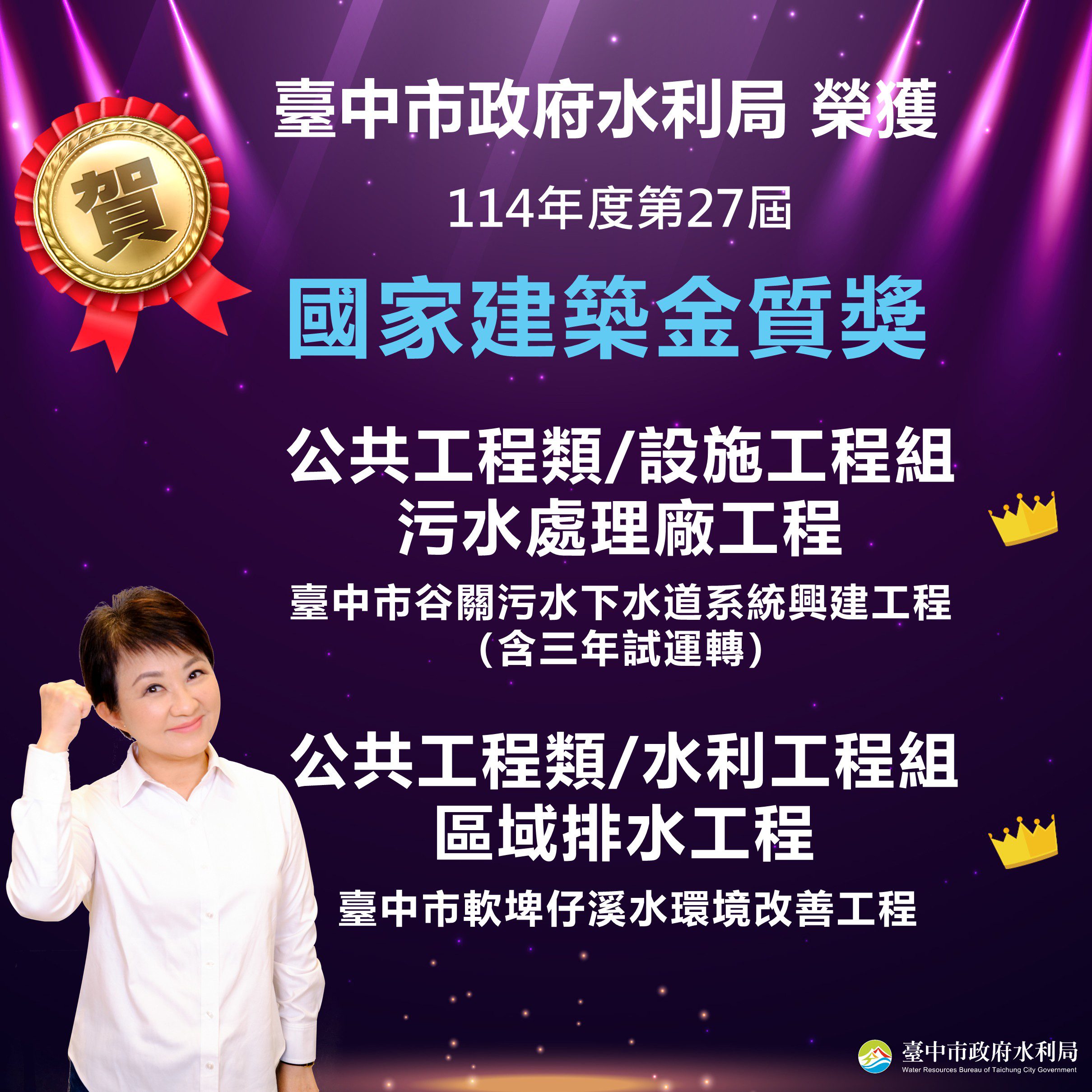 114年第27屆國家建築金質獎頒獎典禮於昨(16)日盛大舉行,台中市政府水利局「台中市谷關污水下水道系統興建工程(含三年試運轉)」及「台中市軟埤仔溪水環境改善工程」雙雙獲獎,其中「軟埤仔溪水環境改善工程」更勇奪全國首獎殊榮,水利局長期深耕水環境營造,此項榮耀不僅代表各界對臺中市水利團隊的高度肯定,更是激勵團隊持續精進的重要動力。
