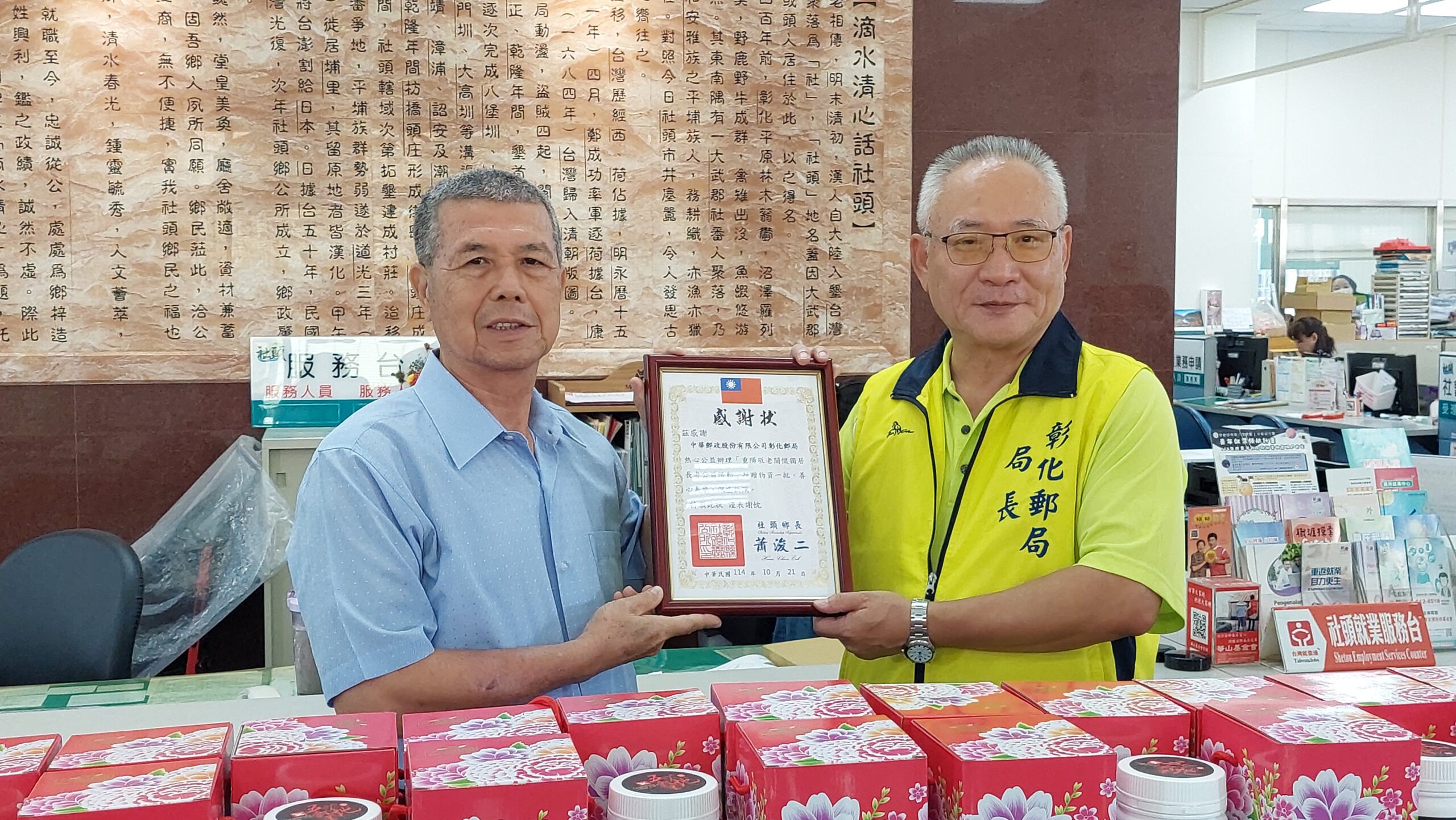 ▲蕭鄉長特別致贈感謝狀以表示對彰化郵局的謝意並拍照留念。(圖/記者蕭麗鳳攝)
