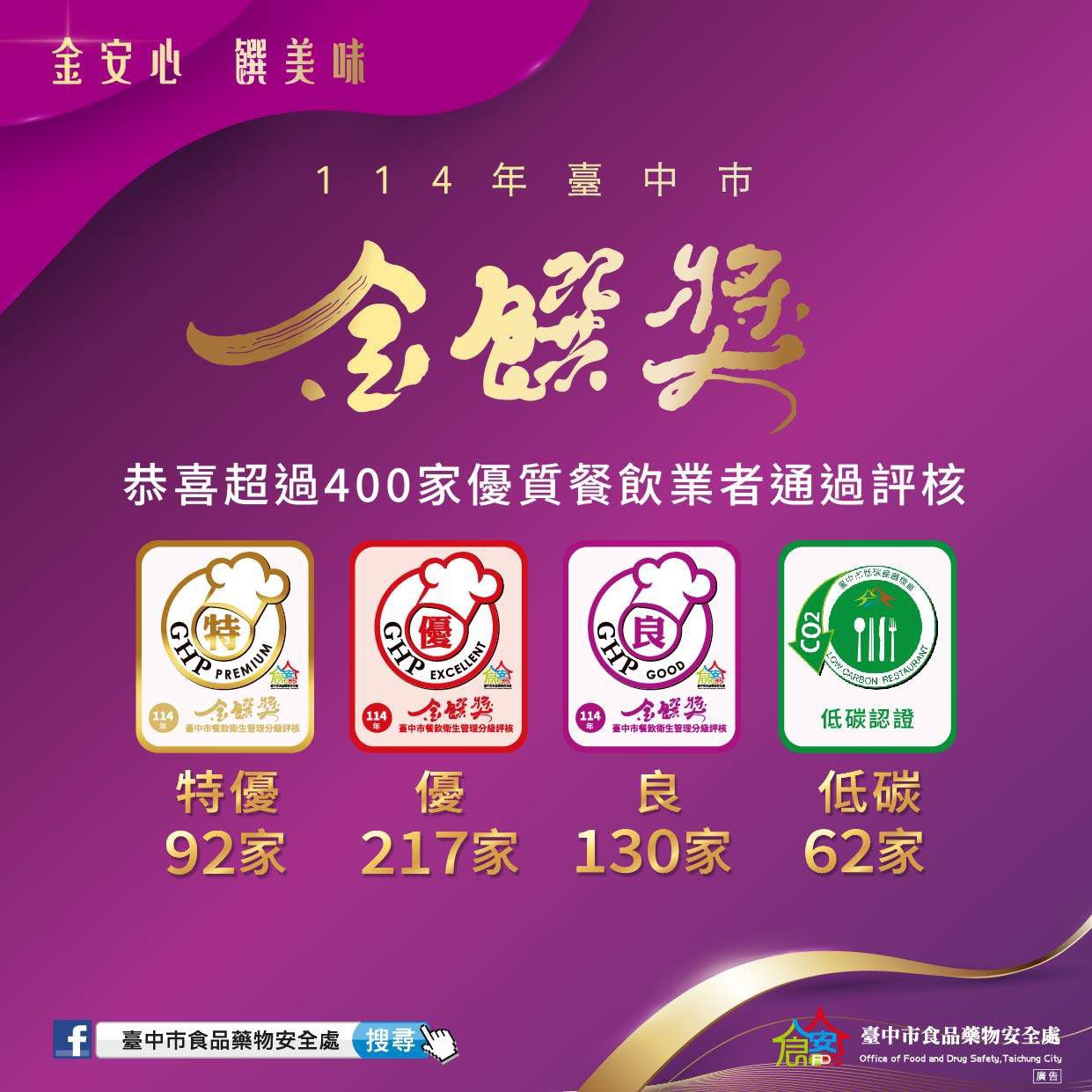 臺中市被譽為美食之都,為了讓市民及旅客安心品嚐佳餚,每年辦理「臺中金饌獎」公開評核出優良餐飲業者,114年已邁入第10年,10月17日於臺中市政府臺灣大道市政大樓舉辦臺中市『金饌獎』授證典禮,由衛生局局長曾梓展代表市長頒發「特優」、「優」、「良」證書,肯定本市439家業者落實衛生管理的努力與成果。