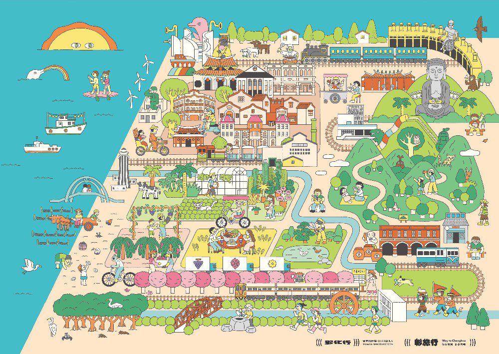為了勾起旅人們對彰化的好奇心與共鳴,《彰旅行》與知名插畫家aka溪湖孫女「包大山」合作主視覺,用畫筆細膩勾勒出彰化的城市全景圖,結合六大探索路徑,以概念性、故事性、趣味性來展現彰化的世界觀。細細探究,不難發現彰化人熟悉的生活場景如鹿港喝麵線、花果產銷運輸、一日雙爐、二水跑水祈福等等,都不禁讓人會心一笑。