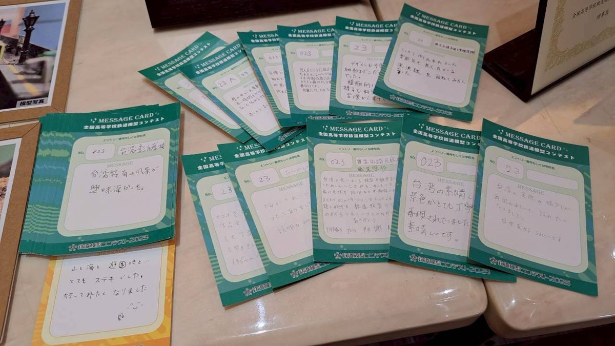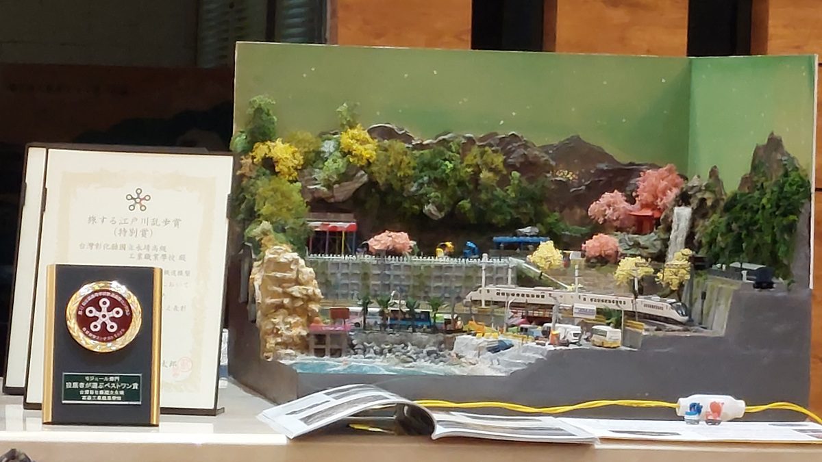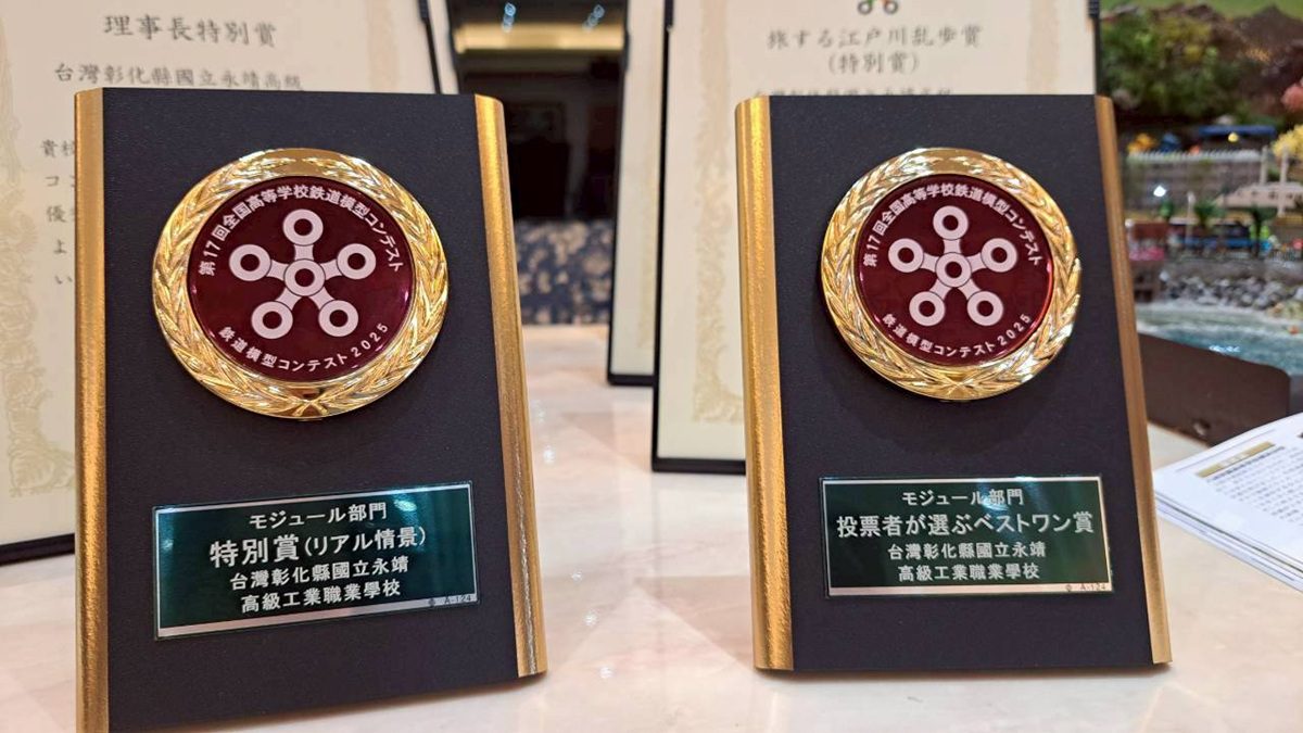 除此之外,為了到日本比賽現場展示並解說,團隊還製作了一分鐘的日文介紹影片、依據場景撰寫日文旅遊文學創作、準備三到五分鐘現場簡報,以及線上英文版的製作歷程回顧日記。到日本參賽三天,每天自早上便用生澀的日文不斷招呼觀眾,熱情介紹作品。這份努力與真誠,也獲得日本觀眾的肯定與讚賞。競賽結果,永靖高工共獲得一金、一銀、四銅,創下 2025 年 184 所參賽學校中獲獎數最多的紀錄。在10月25日則是參加在臺中驛鐵道文化園區舉辦的第一屆全國科技教育鐵道模型創意競賽,榮獲第一名佳績!