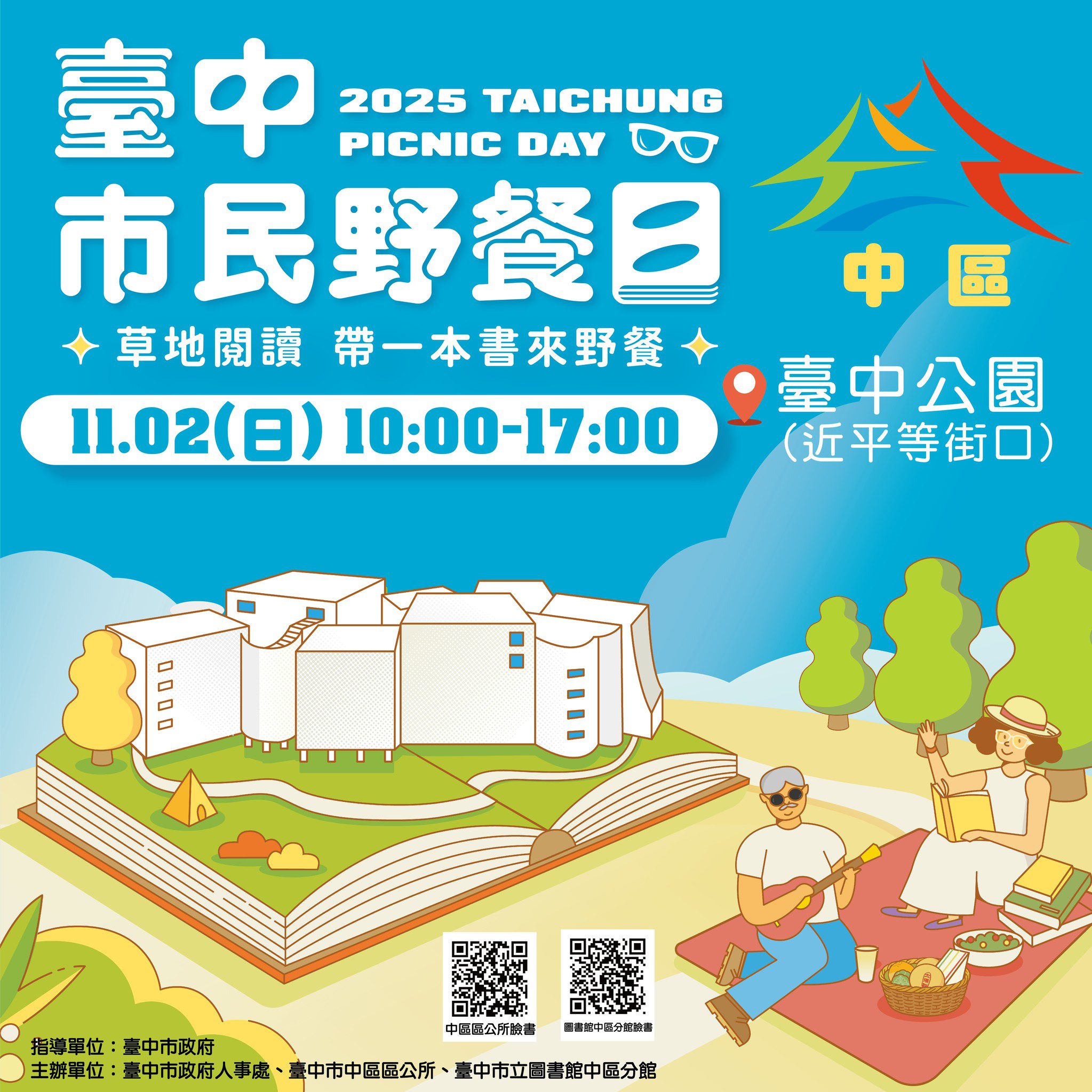 「2025台中市民野餐日」將於11月2日(星期日)盛大登場!今年呼應「台中綠美圖」試營運,以「草地閱讀」為主題,於全市29個行政區同步舉行;中區場次在台中公園(近平等街口)熱閙展開。活動由台中市政府人事處及中區區公所主辦,市立圖書館中區分館協辦,以閱讀為核心,結合中區舊城文化與新住民特色,打造一場以「新舊多元文化,讀見彼此」為主軸的戶外盛會,邀請市民攜家帶眷、呼朋引伴在綠意與陽光中,享受閱讀與交流的美好時光。