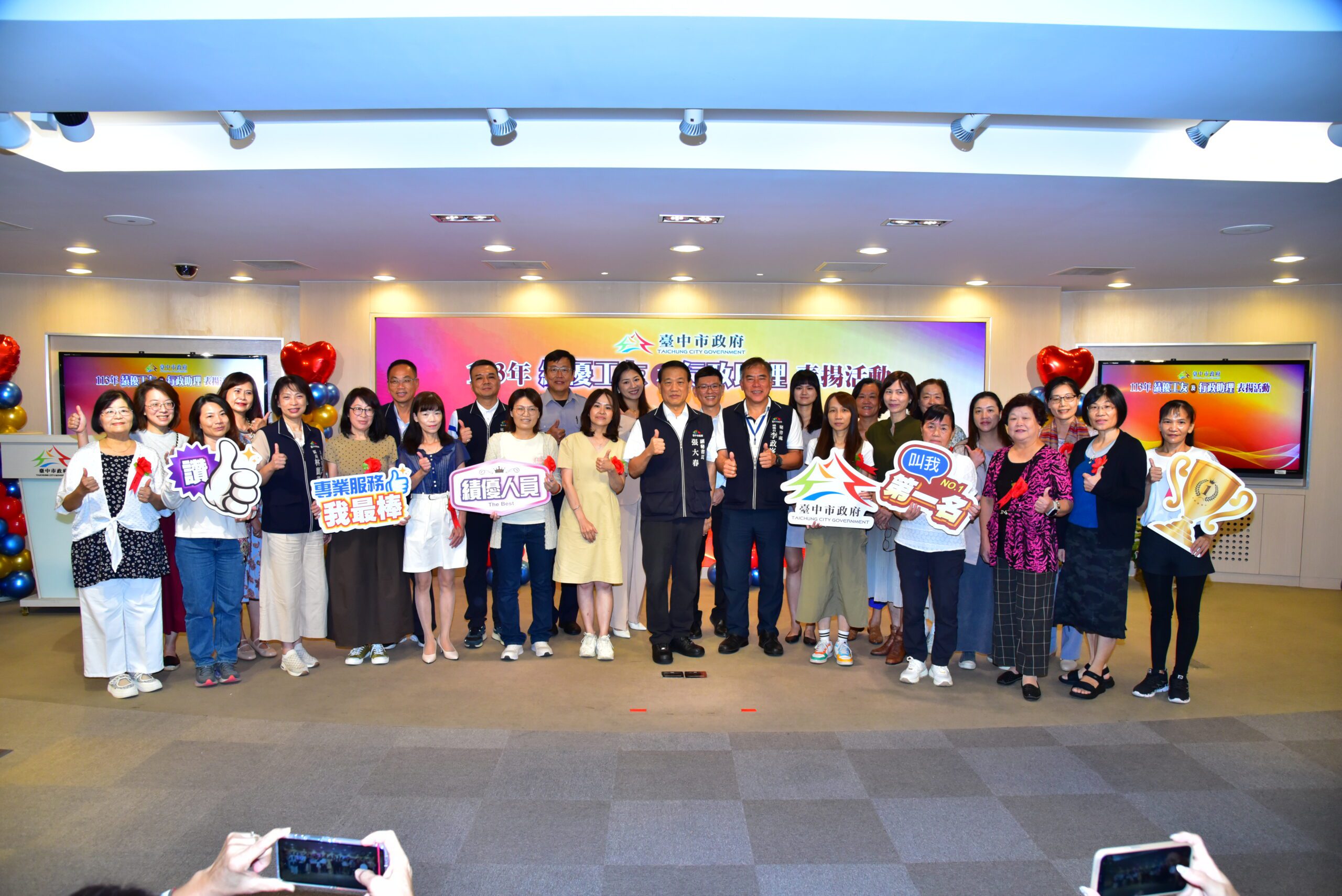台中市政府今(29)日舉辦「113年績優工友及行政助理表揚活動」,表揚績優工友(技工、駕駛,以下簡稱工友)20名、行政助理40名,由副秘書長張大春頒獎並與獲獎同仁合照留念,感謝基層工作夥伴在工作崗位上的協助及辛勞奉獻。市府秘書處表示,為鼓勵市府及所屬機關學校工友及行政助理在市政上的配合及付出,市府每年均辦理績優工友及行政助理選拔,感謝基層工作夥伴的協助與努力。