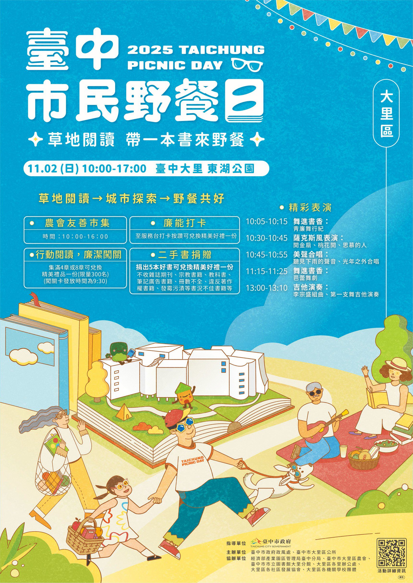 由台中市政府政風處與大里區公所共同主辦的「2025第四屆台中市民野餐日」大里場,將於11月2日(星期日)上午10時至下午5時在大里東湖公園舉行。今年活動以「草地閱讀.帶一本書來野餐」為主題,邀請市民一起在陽光下享受書香與輕鬆的幸福時光。